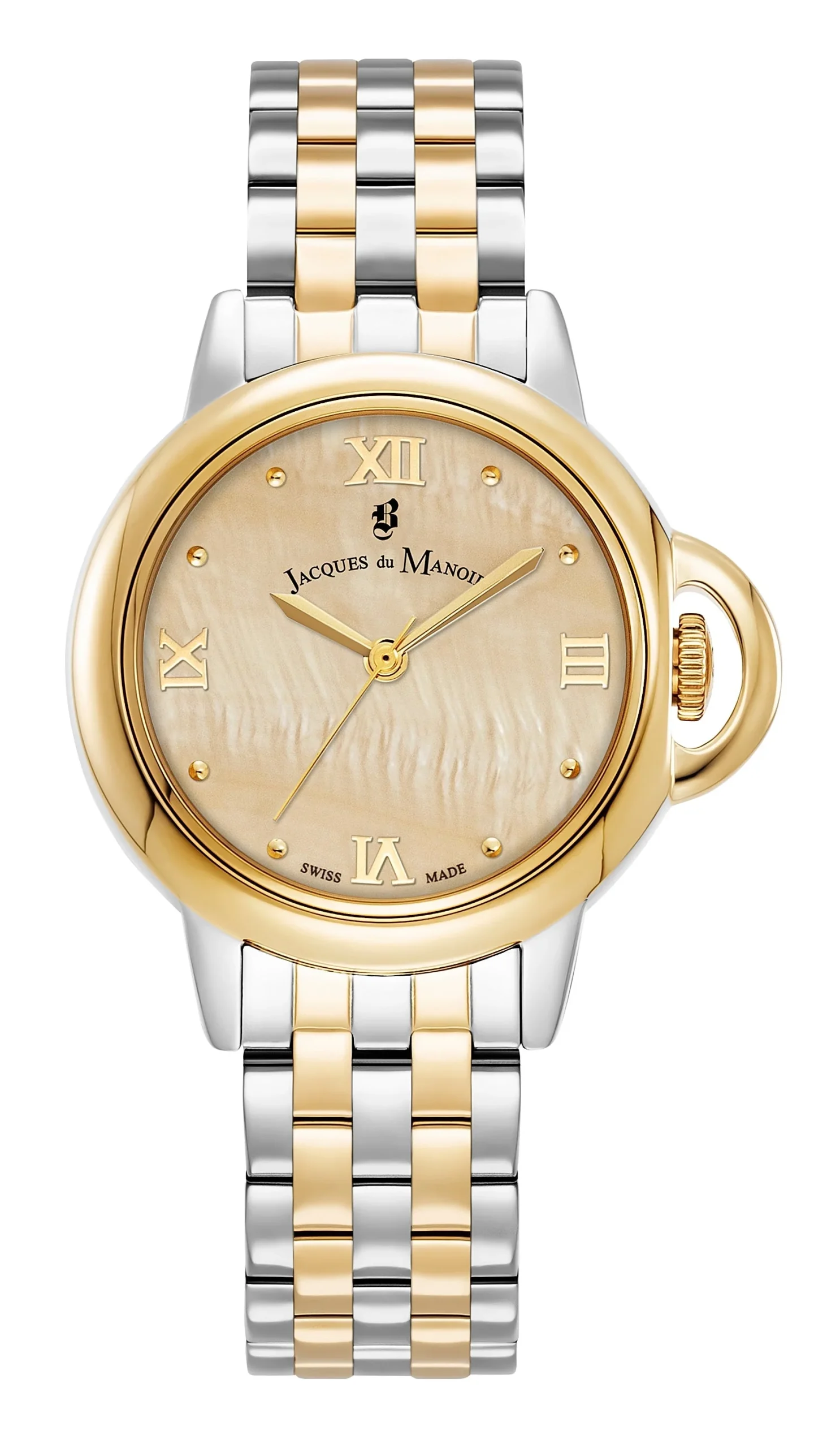Elegantly designed for everyday sophistication, the JDM Grace 32mm women’s watch blends timeless appeal with modern finesse. Featuring a polished gold and silver stainless steel strap and a refined round brass case, this timepiece showcases impeccable craftsmanship in a compact 32mm form. The gold dial under mineral crystal glass adds a touch of understated luxury, while the quartz movement ensures reliable precision. Ideal for any occasion, its 3 ATM water resistance offers practical splash-proof protection. A folding clasp secures the bracelet with ease and comfort, making it as functional as it is stylish. Perfectly positioned in the women’s watch category, this piece stands out with its graceful dual-tone contrast and minimalist design, appealing to those who appreciate both fashion and function in a high-quality stainless steel watch.