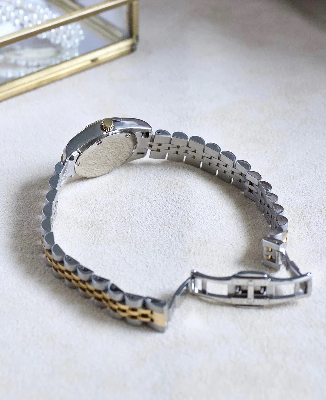 The JDM Inspiration 26mm Two Tone Crystal Bezel Watch epitomizes elegance and modernity, making it a must-have for the discerning woman. Crafted with a stainless steel case in a stunning two-tone finish, this watch features a shimmering crystal bezel that captures light beautifully. The pristine white dial is complemented by a Swiss quartz movement, ensuring precision and reliability. Water-resistant up to 50 meters, it is as functional as it is stylish. The luxurious stainless link bracelet adds a refined touch, seamlessly transitioning from day to evening wear. Whether paired with casual attire or formal wear, this watch is designed to be a statement piece, embodying both charm and sophistication.