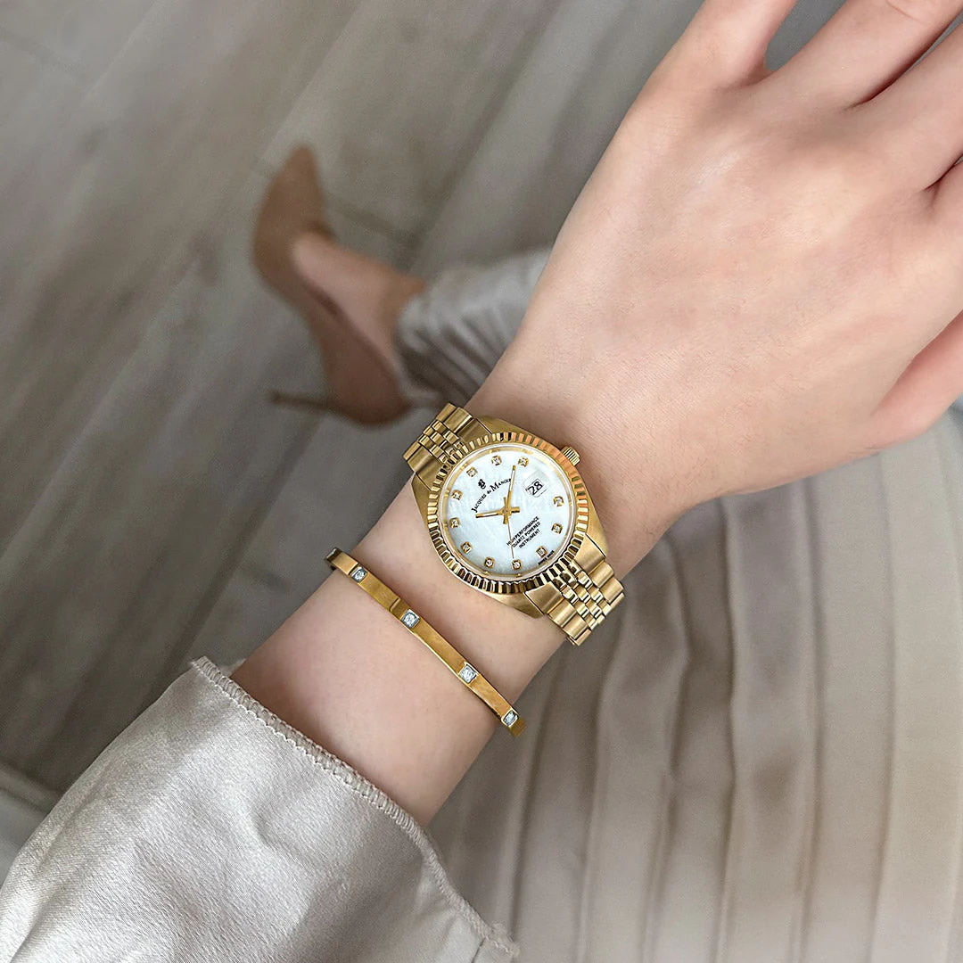 The INSPIRATION for today’s modern woman is refreshingly different. Shimmering metal in a firework of extraordinary combinations is the focal point of this fascinating ladies’ watch from the current JACQUES DU MANOIR collection. From a distance, you could almost mistake the analogue metallic watch for a unisex model. A closer look, however, reveals the magical feminine charm of the details in the INSPIRATION design. This watch will always grab people’s attention and accentuate your outfit perfectly.