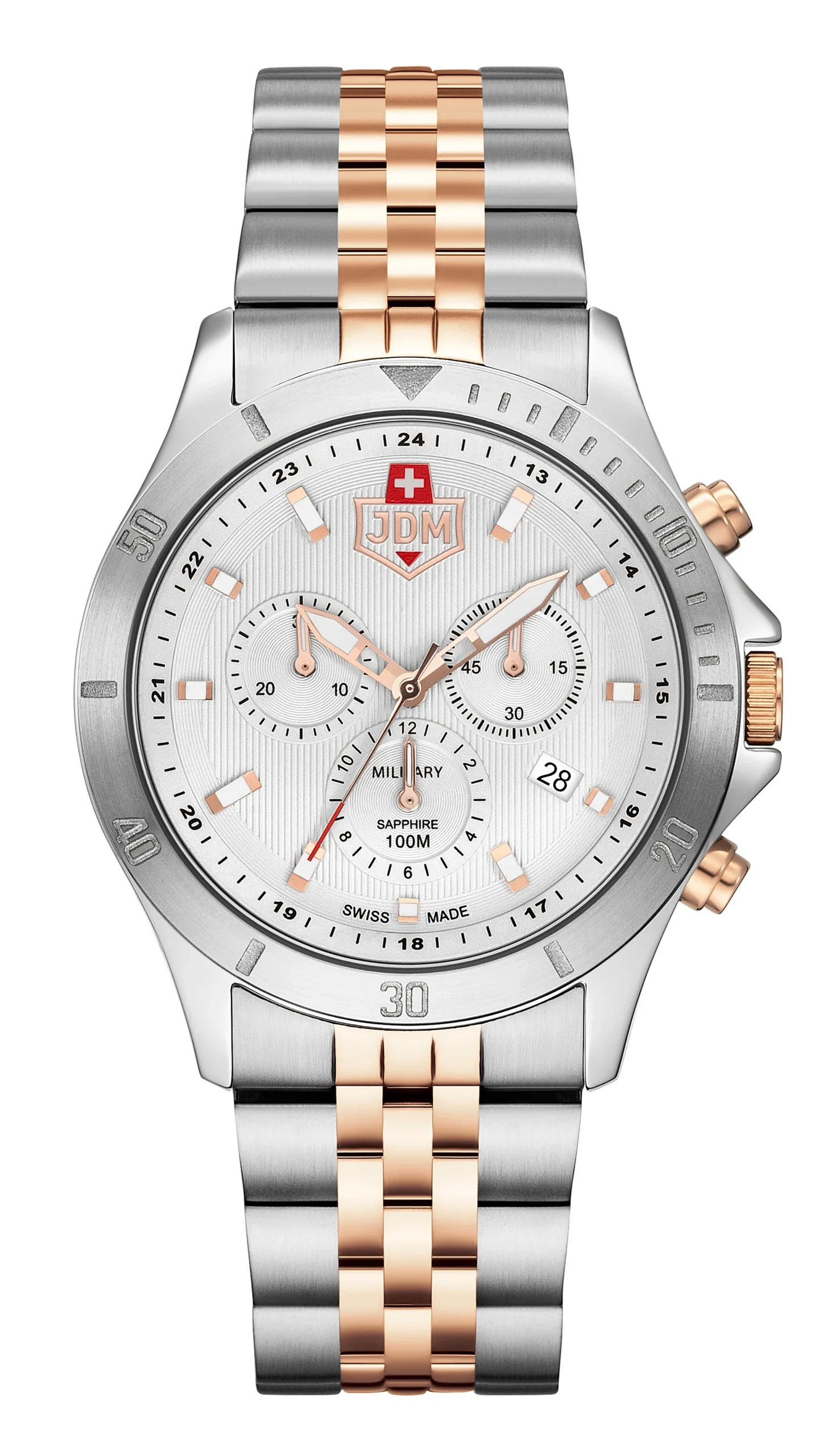 Refined yet rugged, the JDM Military Delta Chrono Two Tone Watch JDM-WG009-02 is a sophisticated men’s watch designed for versatility and impact. Crafted with a 42 mm stainless steel case and a two-tone silver and rose gold bracelet, it delivers a bold presence with elegant detail. A silver guilloche dial features luminescent hour markers, a small seconds subdial, and a date display, all protected by a durable sapphire crystal. This Swiss-made timepiece combines quartz precision with durable performance, offering 100-meter water resistance and a 22 mm stainless steel bracelet for lasting comfort. Ideal for those who appreciate both form and function, it stands out in the world of watches for its seamless balance of sporty style and timeless craftsmanship.