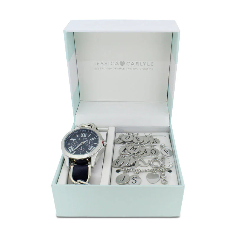 The Jessica Carlyle Navy Leather Strap Silver Watch & Bracelet with Charms Set is an assorted kit of accessories, suitable for your casual lifestyle.