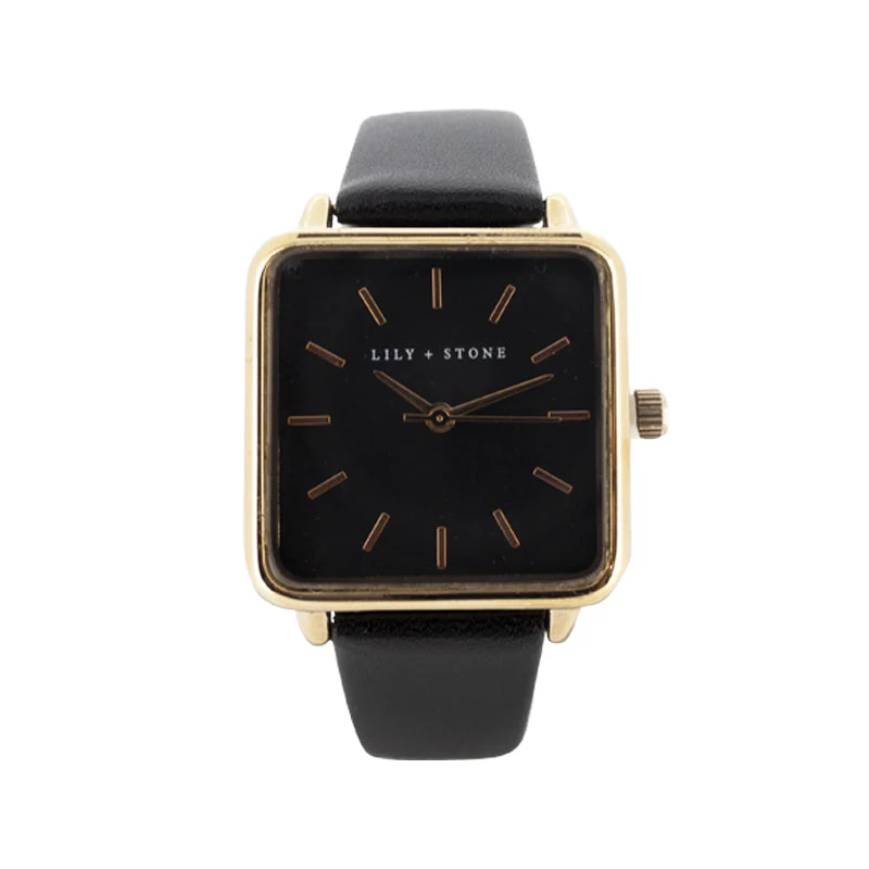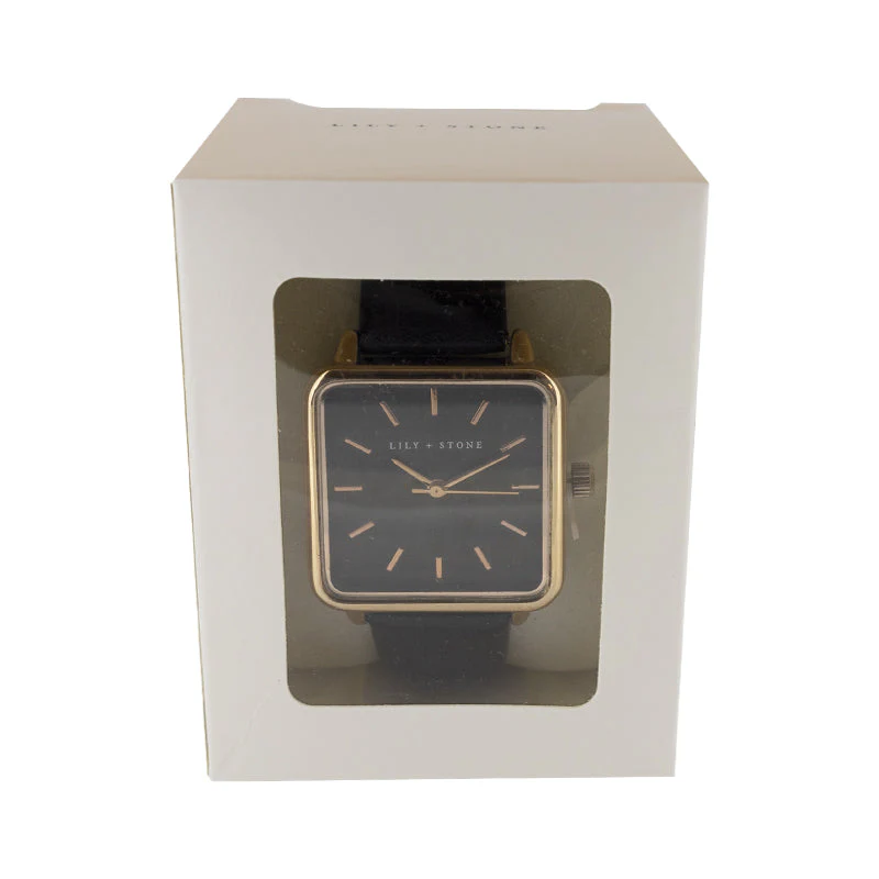 Introducing the Lily & Stone Rose Gold & Black Ladies Watch, where elegance meets contemporary design. Its on-trend square case in rose gold pairs impeccably with a classic black strap. The watch features an analogue display and a golden dial, making it a versatile accessory for any outfit.