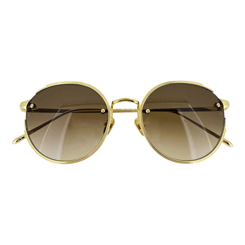 Layers of 22 carat yellow gold plated with titanium. Ladies oval shape sunglasses from Linda Farrow.
