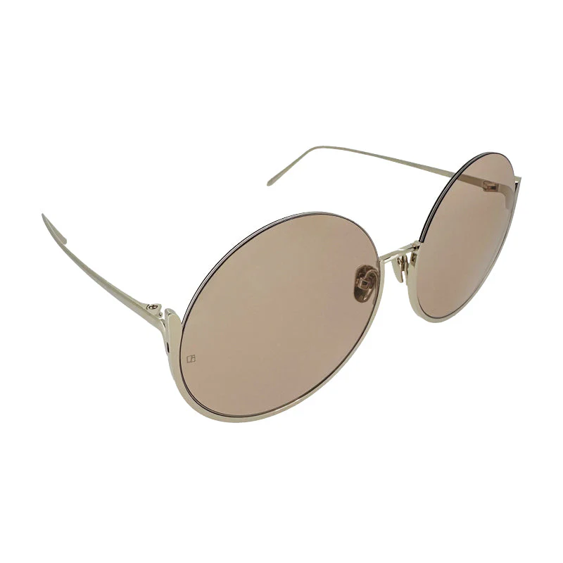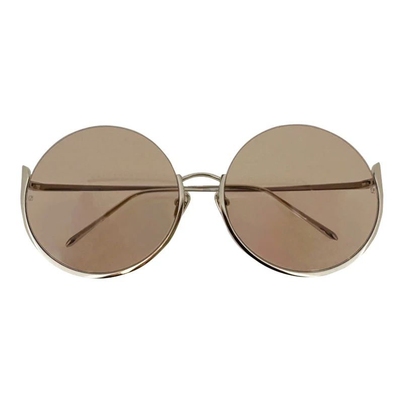 Oversized ladies round yellow gold sunglasses from Linda Farrow with a half rim design and adjustable nose pads for comfort.