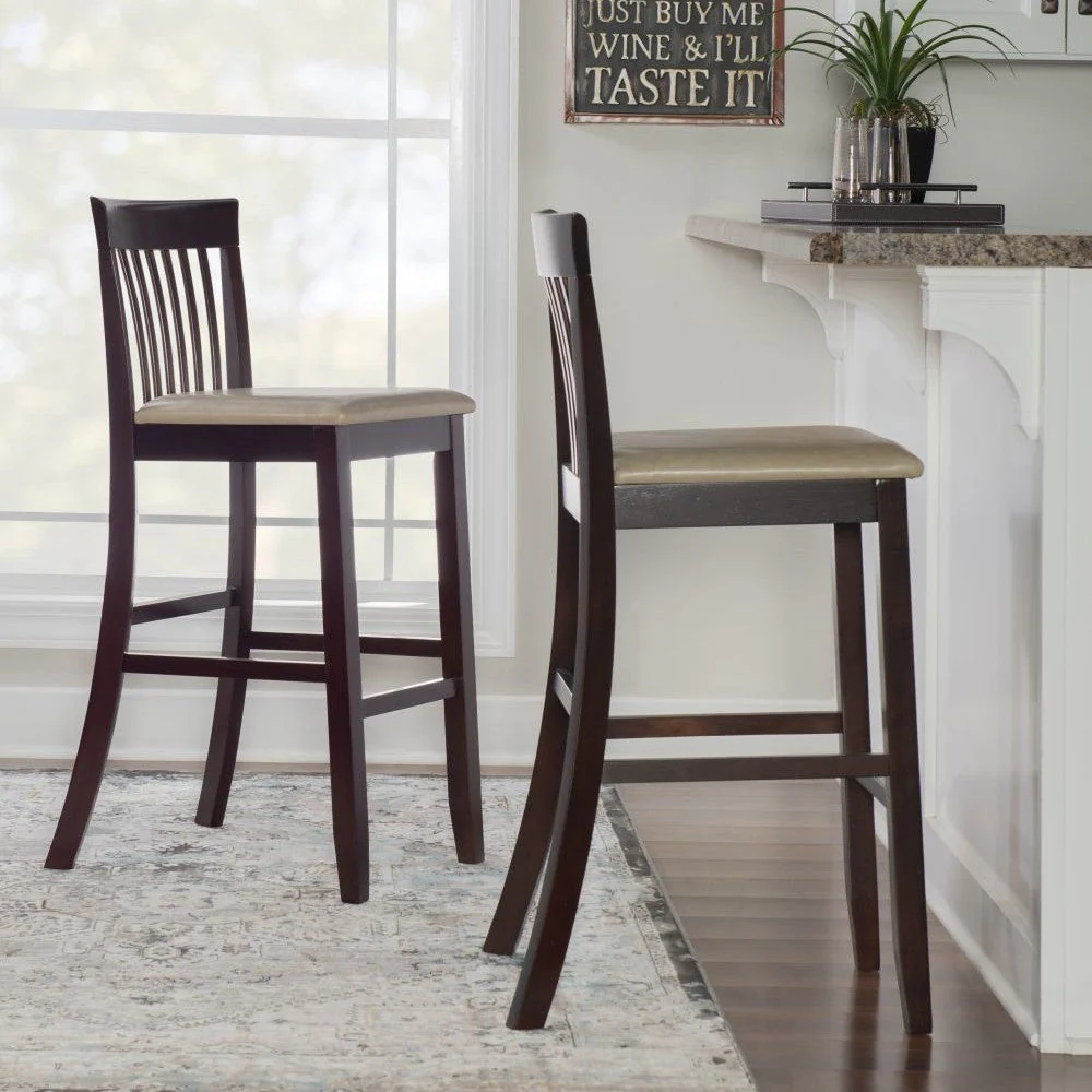With a traditional Mission back styling, this counter stool will enhance your dining or casual gathering area with its casual charm. The wood frame is finished in a rich espresso brown and features a contrasting dove grey faux leather padded seat. The seat height is 30.75-inches from the floor, accommodating any table or bar you want to pair it with. Solid construction and quality craftsmanship have made this counter stool both sturdy and attractive. This counter stool fits beautifully into a casual or formal decor. 275 pound weight limit.