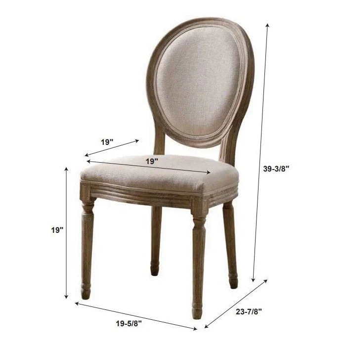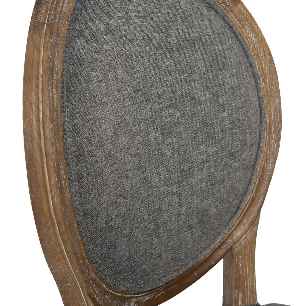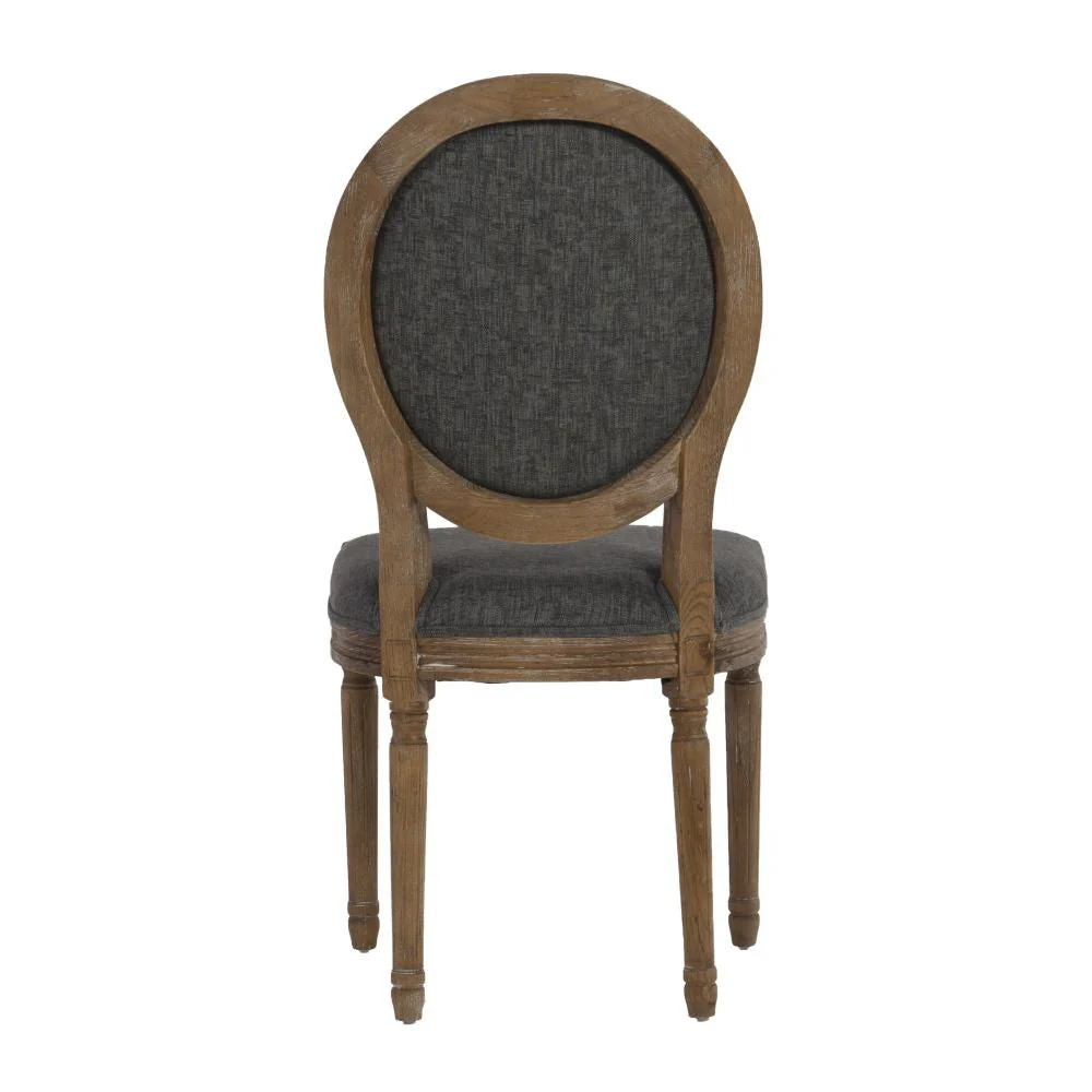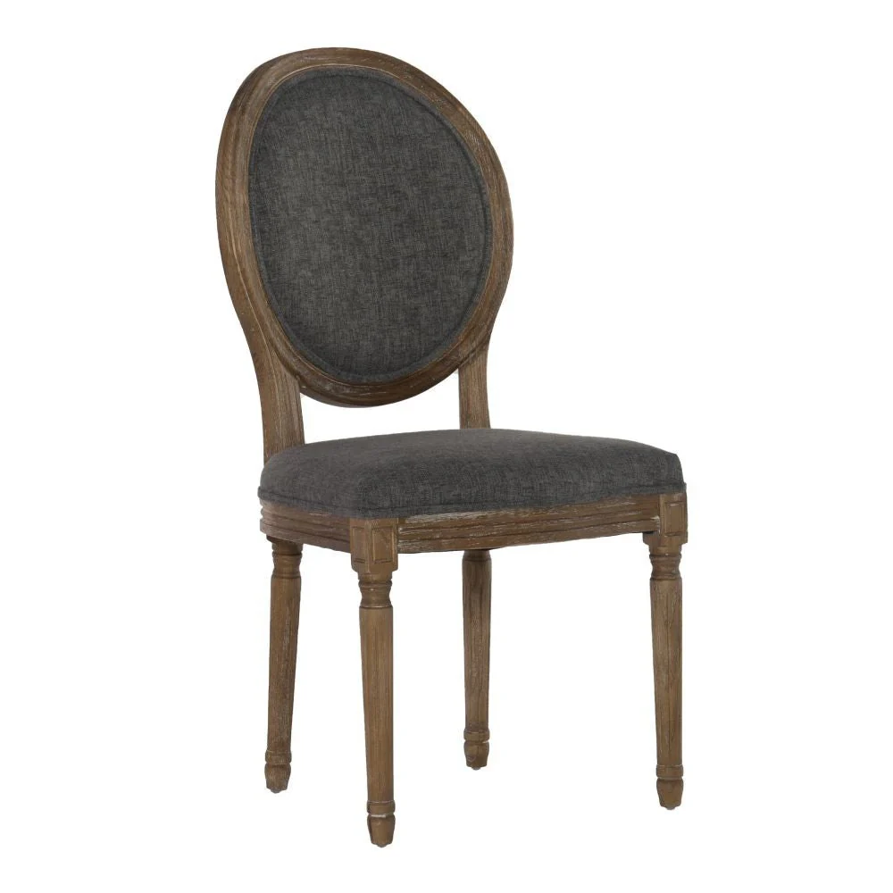 The Avalon Oval Back Chair has a French inspired design and style. Crafted from Elm, the frame has a dark natural brown finish and is accented with detailed carvings. Charcoal colored upholstery graces the seat and chair back. Two piece set.
