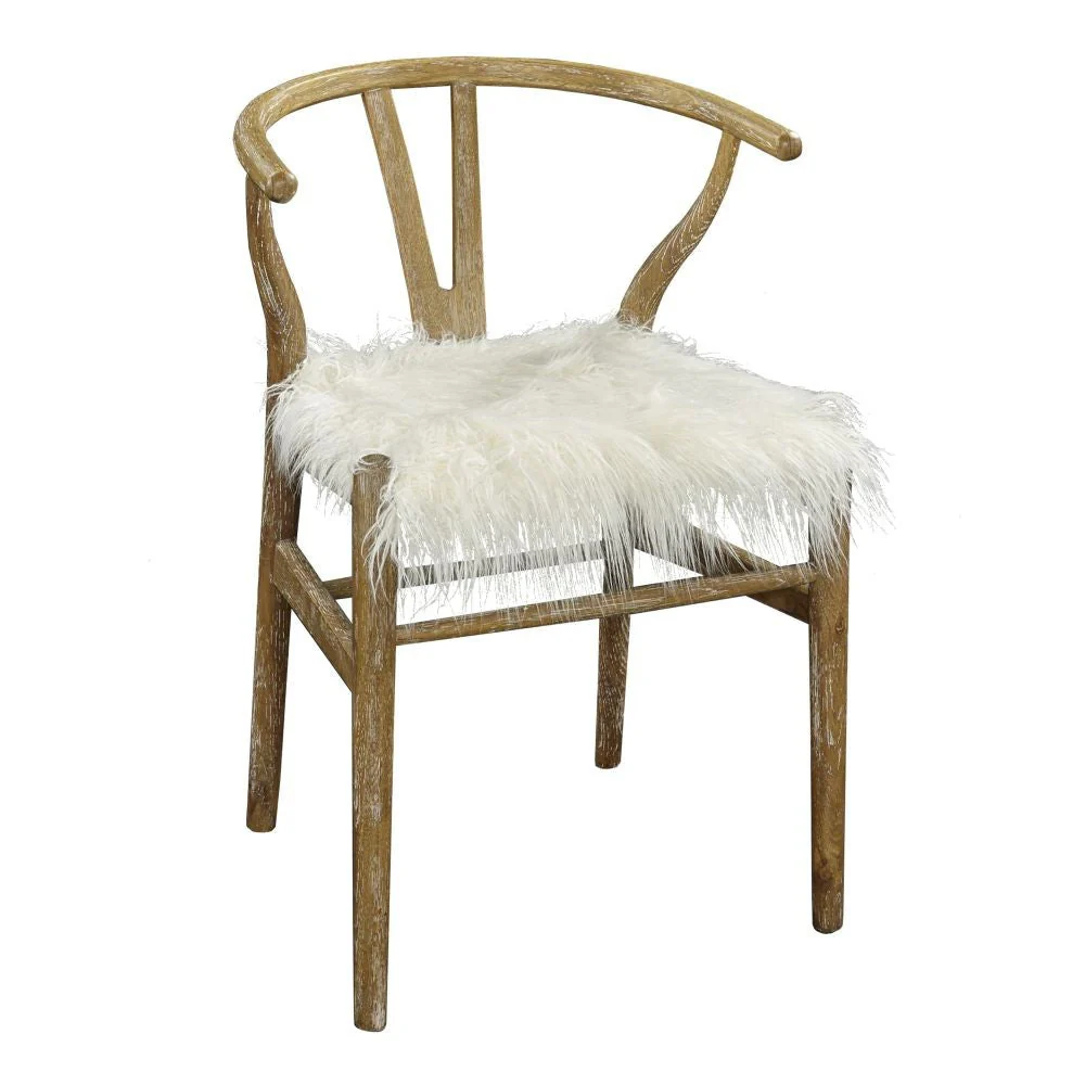 Dramatic and bold, the Ellis Wishbone Chair is perfect for adding fun style to your space. The chair has a trendy wishbone styled frame that is finished in an neutral brown/gray washed finish. The faux fur seat is soft, plush and eyecatching!