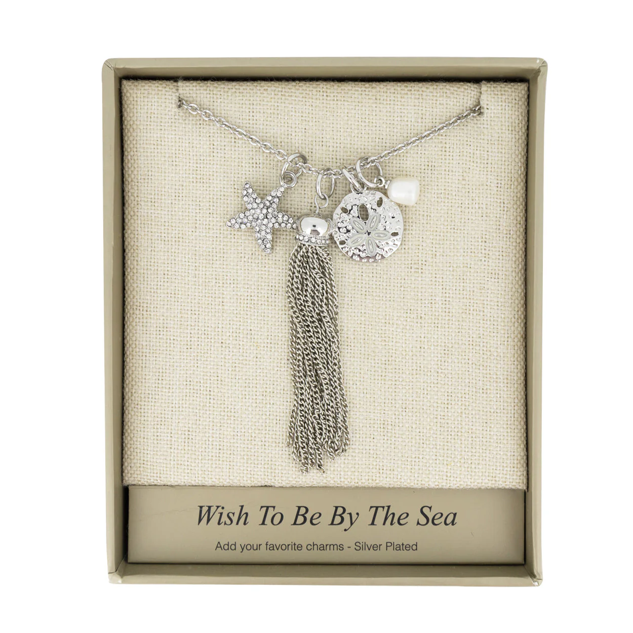 Adorn yourself with the Lovita Silver Necklace and carry the ocean’s charm wherever you go. This exquisite piece is silver-plated, featuring a delicate chain adorned with a trio of pendants: a shimmering starfish embellished with crystals, a lustrous pearl, and a textured sand dollar. Completing the ensemble is an elegant tassel, creating a versatile look that’s perfect for both casual and formal attire.