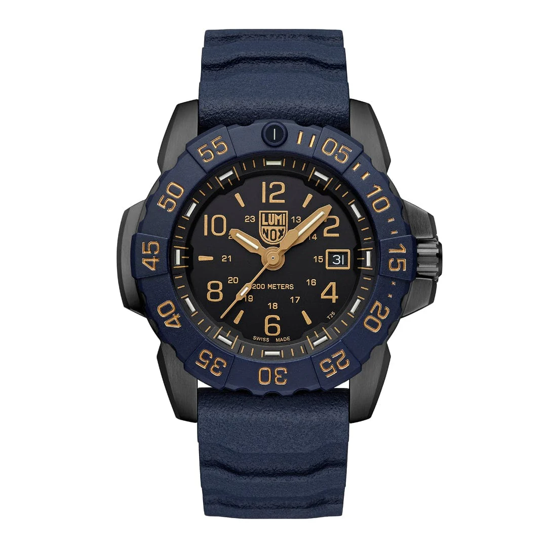 The Luminox Navy Seal Foundation Back to the Blue Black Dial Watch XS.3255.CB.NSF is a remarkable men’s watch that fuses elegance with unparalleled durability. Crafted from high-quality 316L stainless steel and coated in IP black, this 45mm timepiece showcases a striking black dial with contrasting shadow blue and gold accents. Its Swiss Quartz movement ensures precise timekeeping, while the anti-reflective sapphire crystal adds protection and clarity. Designed for extreme conditions, this watch features a uni-directional rotating bezel, luminous hands, and markers powered by Luminox Light Technology for visibility in low-light scenarios. Water-resistant up to 200 meters and secured with a robust rubber strap, this watch is perfect for outdoor enthusiasts and collectors alike. Elevate your style and performance with this iconic tribute to the Navy SEALs.