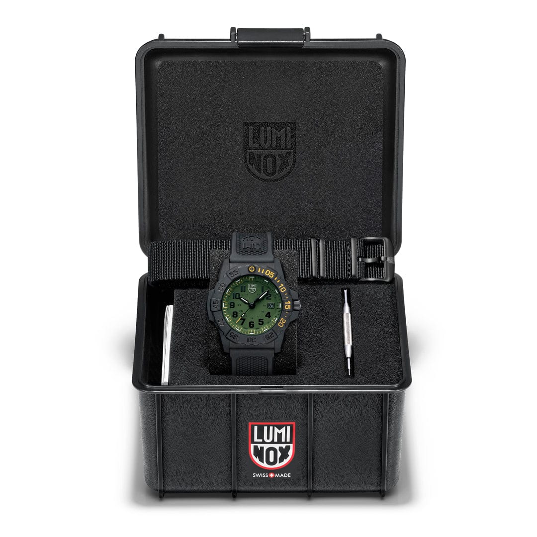 Blending tactical strength with purposeful design, the Luminox Navy Seal Foundation Green Dial Watch XS.3517.NSF.SET stands as a true embodiment of durability and tribute. Designed in cooperation with the Navy SEAL Foundation, this timepiece reflects the unyielding spirit of elite military units through its commanding military green dial accented with striking yellow details. The 4.5 cm CARBONOX™ case and bezel deliver an ultra-light yet rugged frame, engineered to endure the harshest conditions without compromising on comfort or performance.