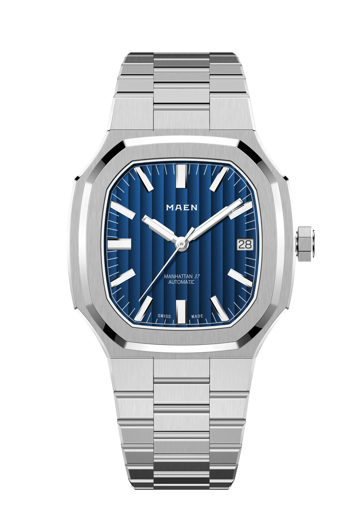 MAEN Watches was founded in 2017 by two Dutch creators who share a sincere focus on quality and detail, taking their name from the old Dutch spelling of “moon,” a symbol of time. Their vision is to offer exceptional quality for reasonable prices by selling directly to consumers and collaborating with industry-leading partners. This Manhattan 37 men’s watch is a refined mechanical timepiece that takes inspiration from 1970s landmark design. It features a sophisticated midnight blue Côtes de Genève dial within a distinctive vertically elongated octagonal bezel. The case, measuring 37 millimetres in diameter and 9.3 millimetres thick, is crafted from 316L stainless steel, offering durability and a seamless silhouette. It runs on a dependable Standard Grade Sellita SW200-1 automatic movement. The fully integrated stainless steel bracelet and scratch-resistant sapphire crystal glass complete this versatile luxury sports watch, which is protected by 100-metre water resistance for active wear.