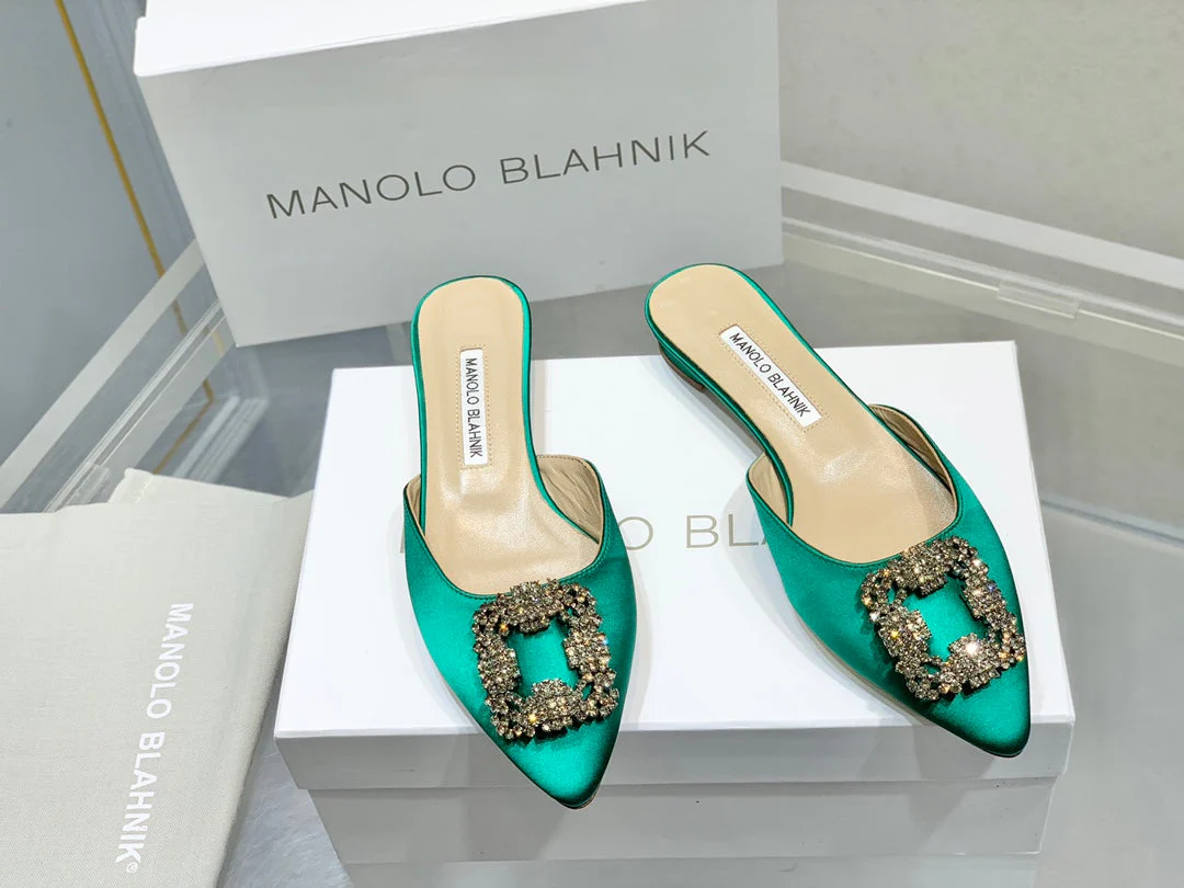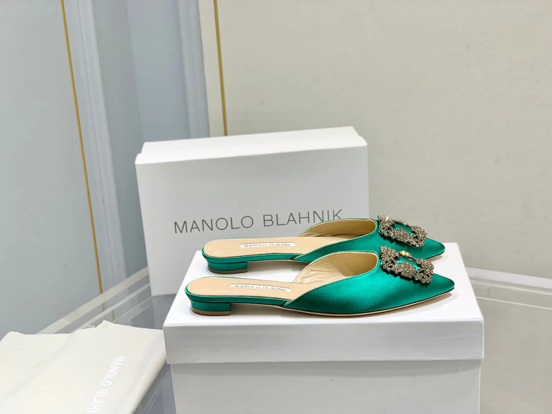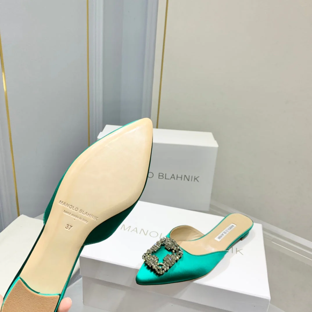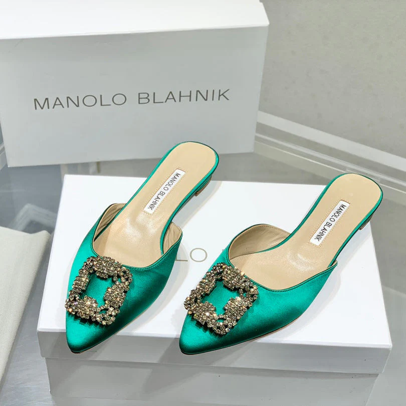 Manolo Buckle Flast Mules Green Silk 327517