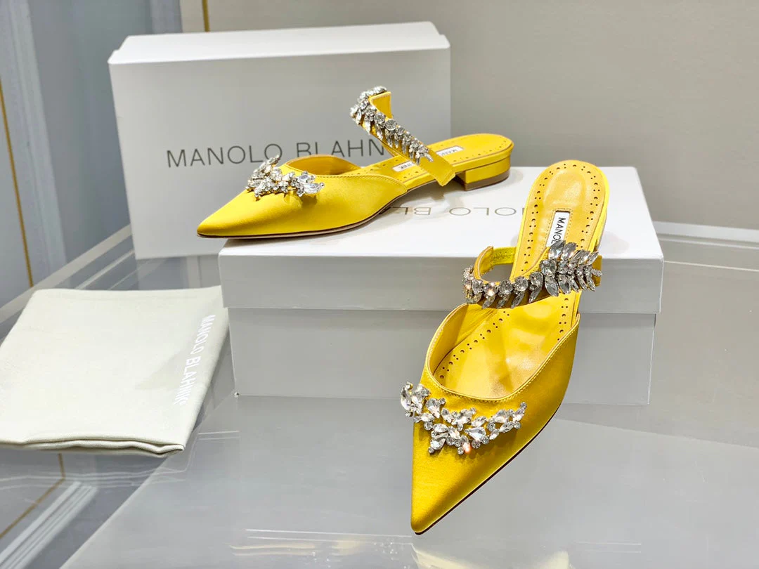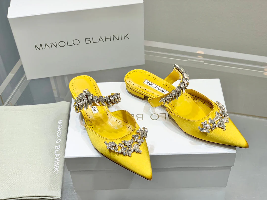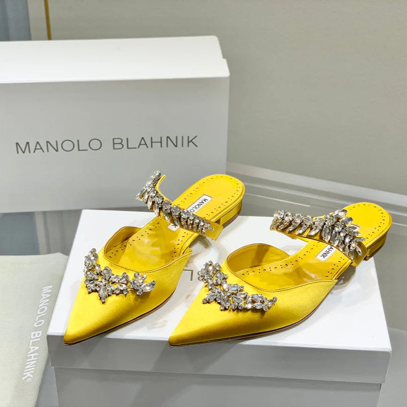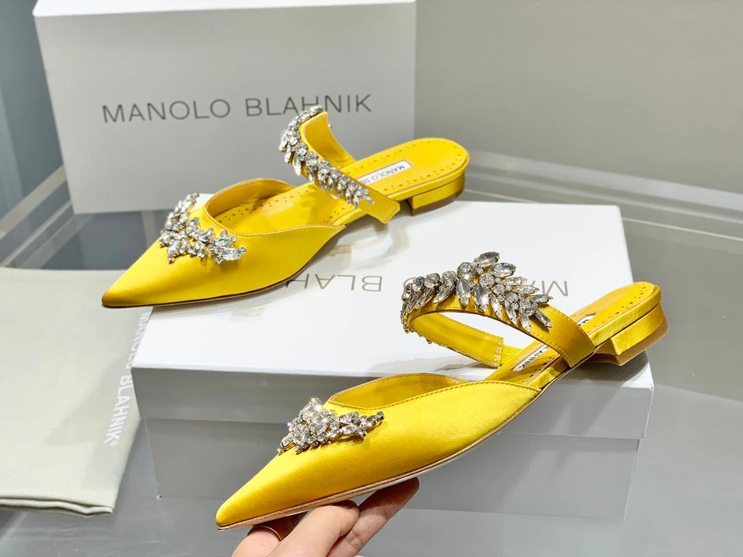Manolo Flats Mules Crystal Yellow Silk Satin 327472