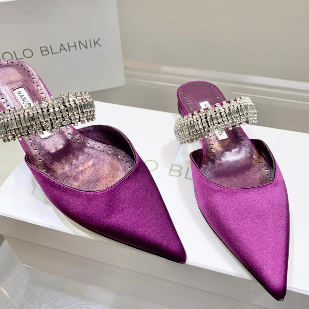 Manolo Flats Mules Diamond Buckle Purple Silk Satin 327487