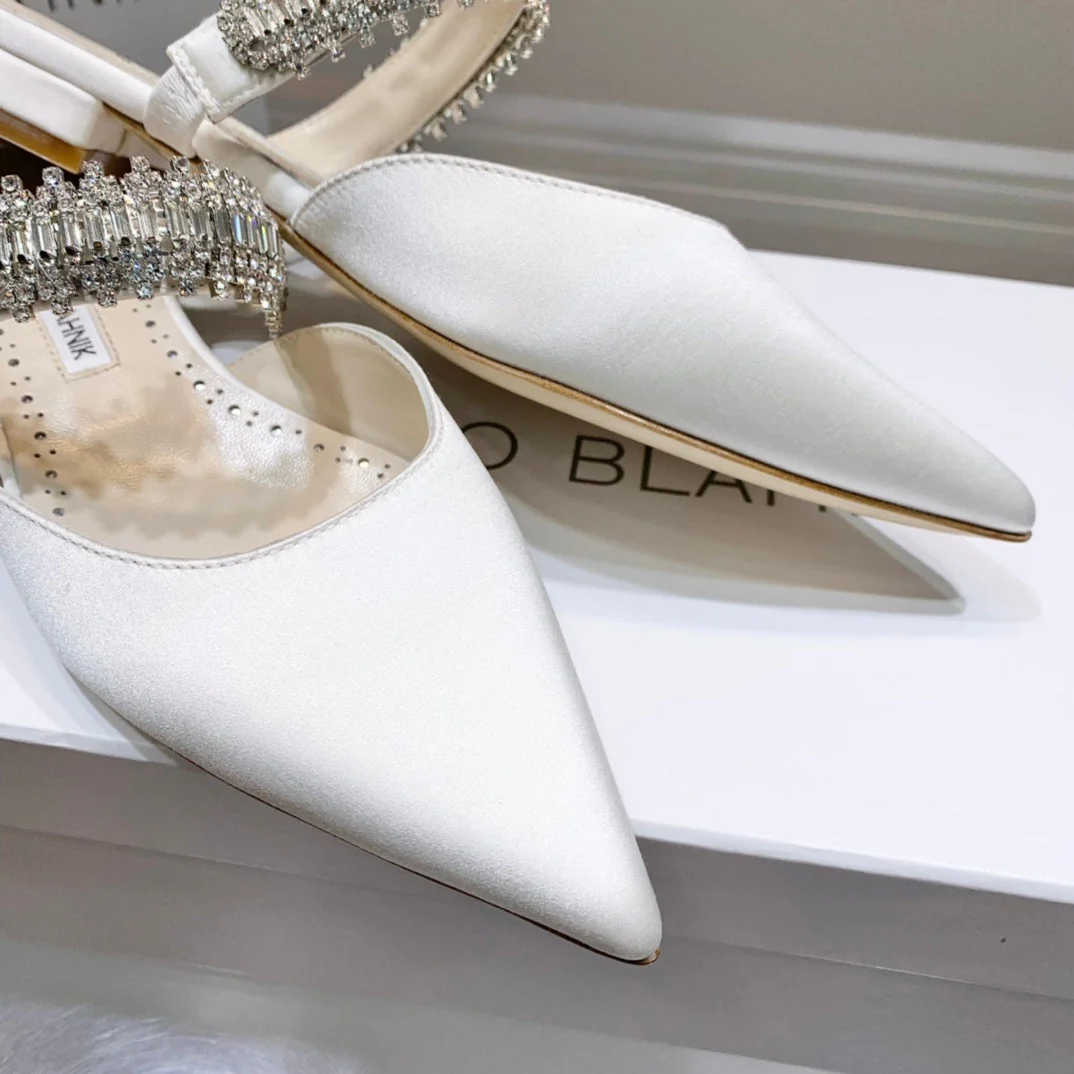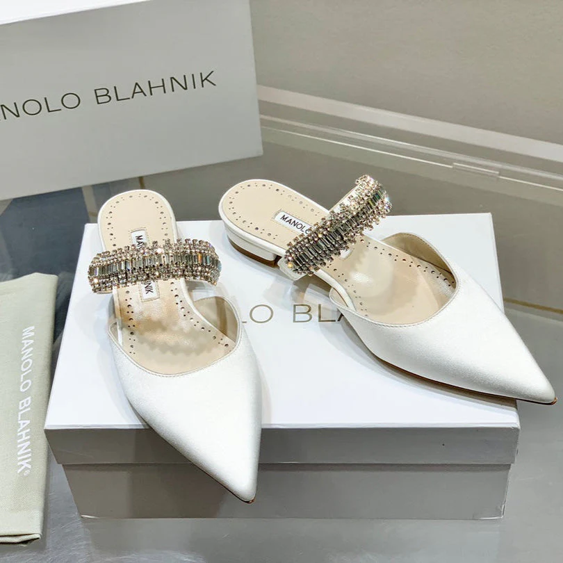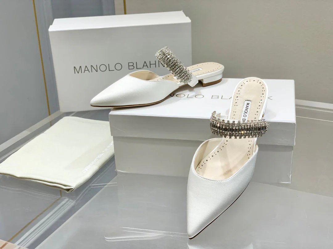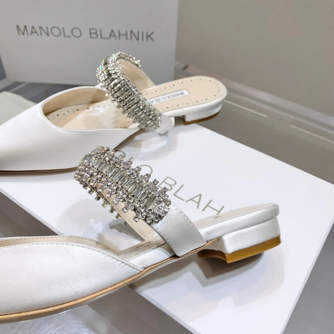 Manolo Flats Mules Diamond Buckle White Silk Satin 327486