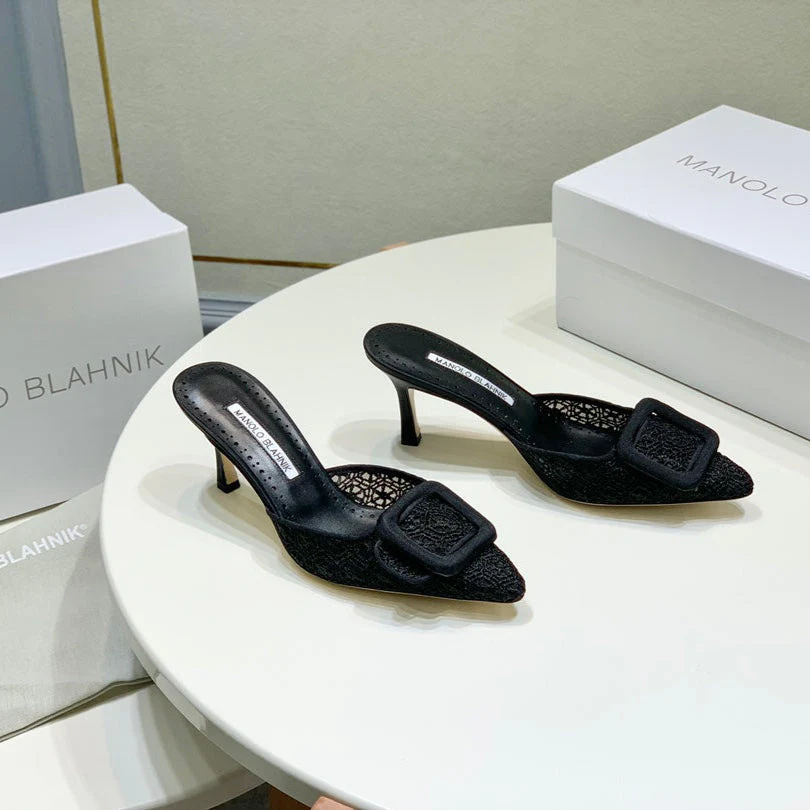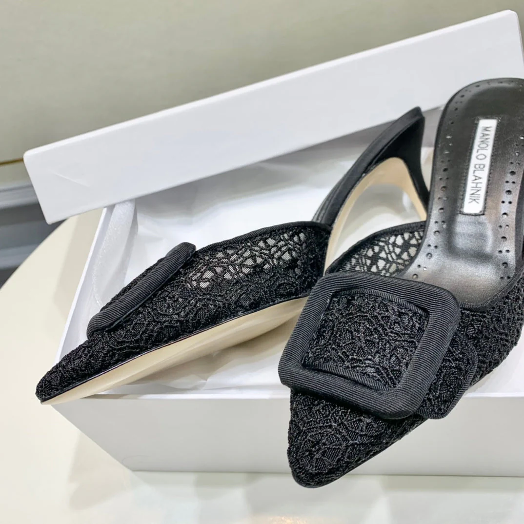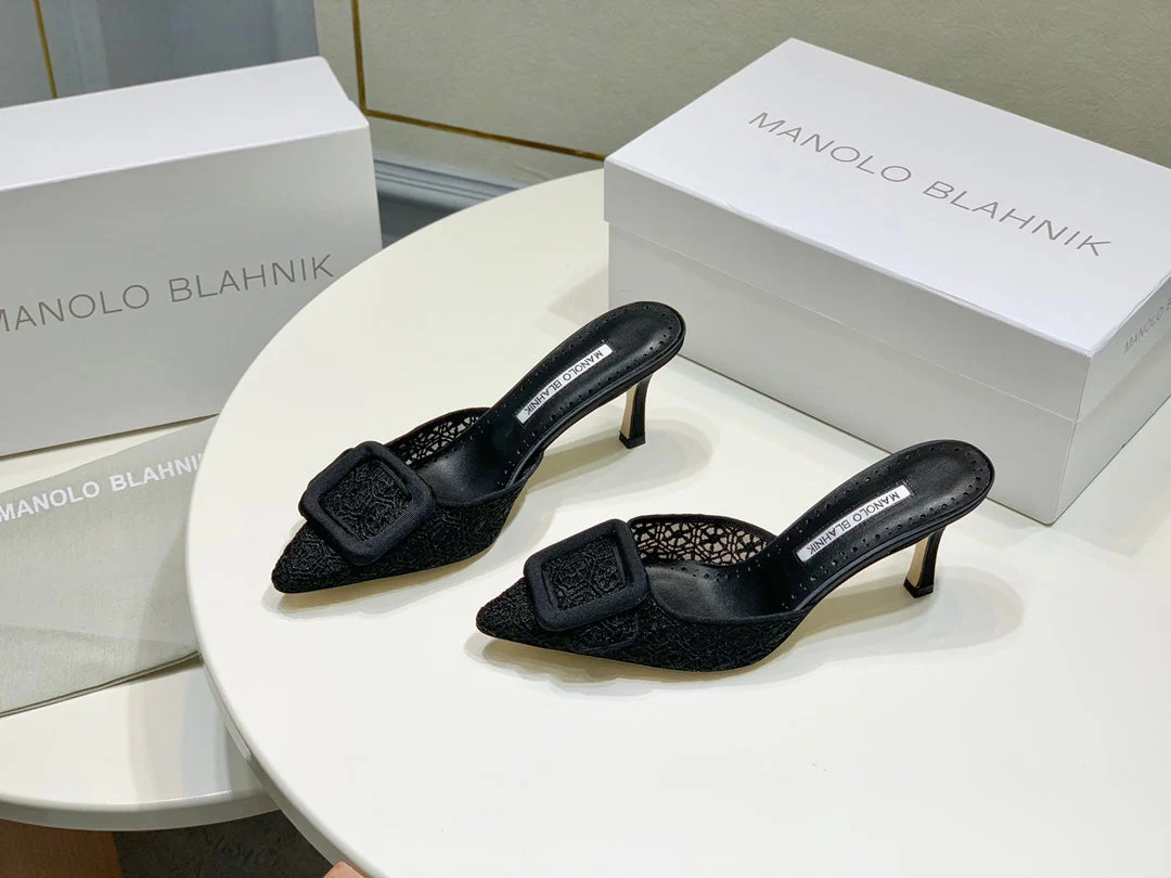Manolo Mules 7cm Black Hollow Lace Leather Bottom 451197