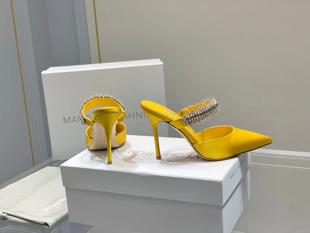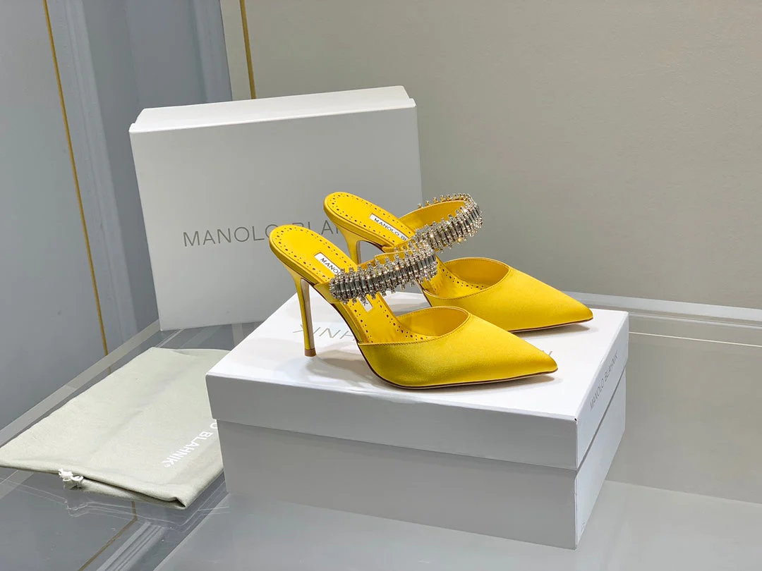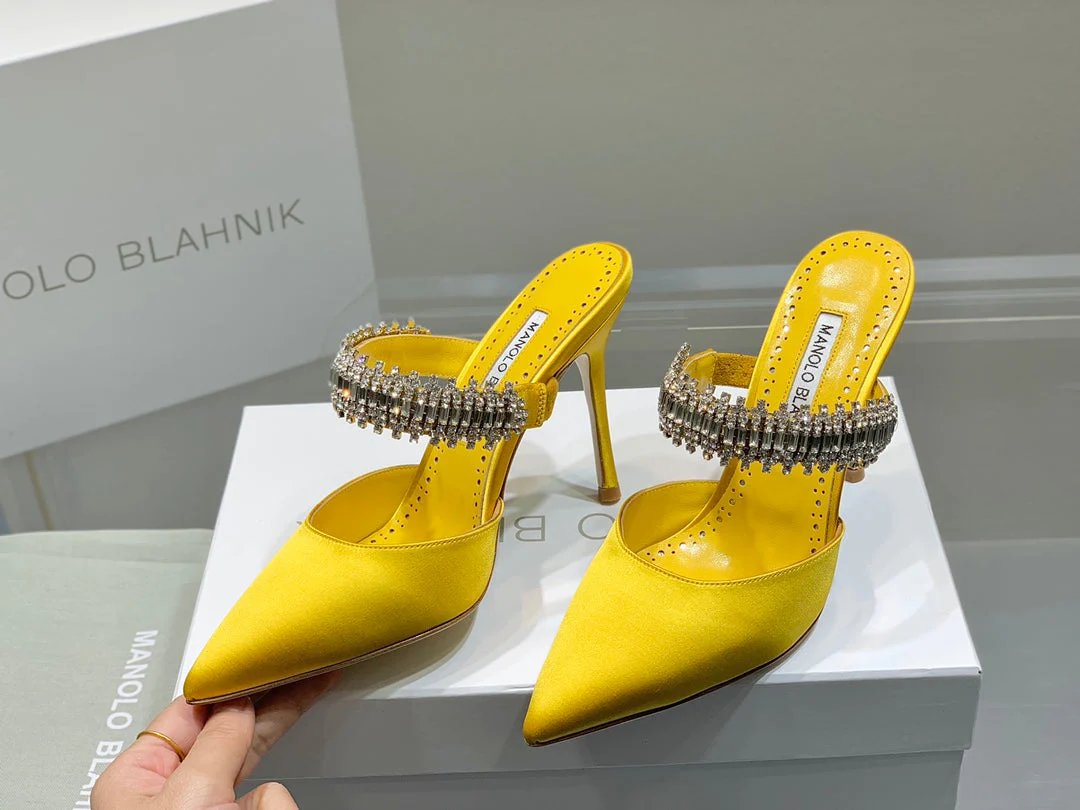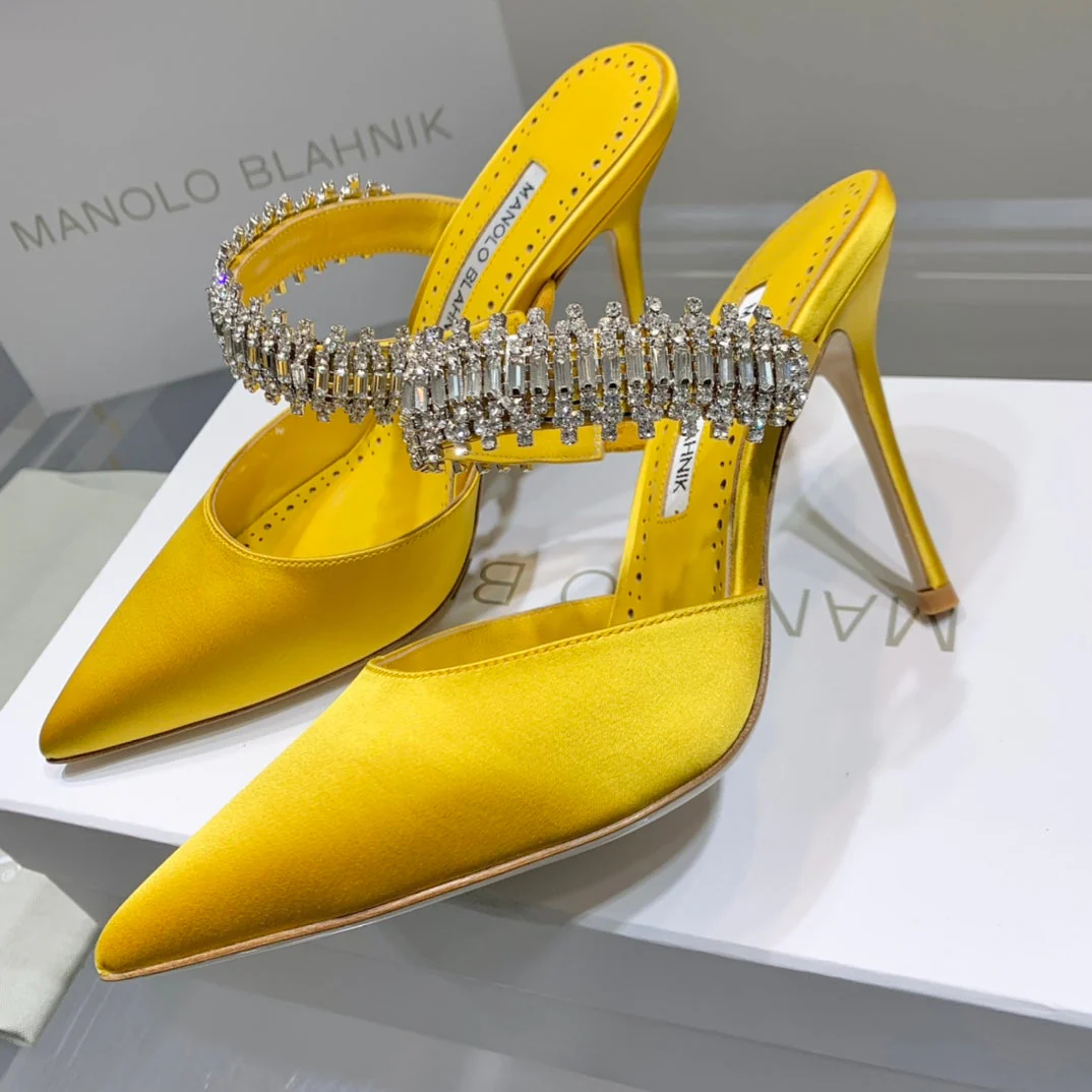 Manolo Mules Diamond Buckle Yellow Silk Satin 218811