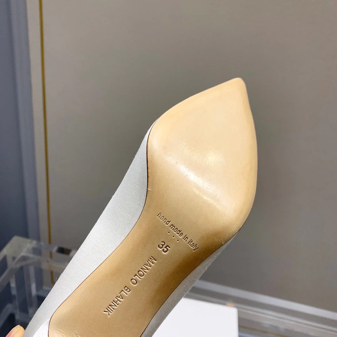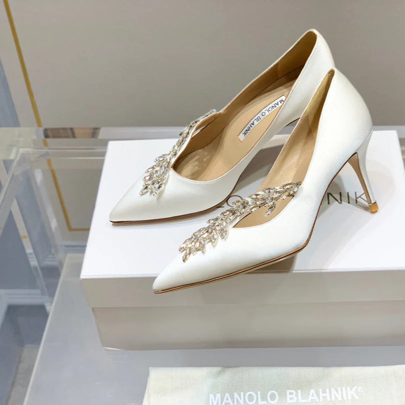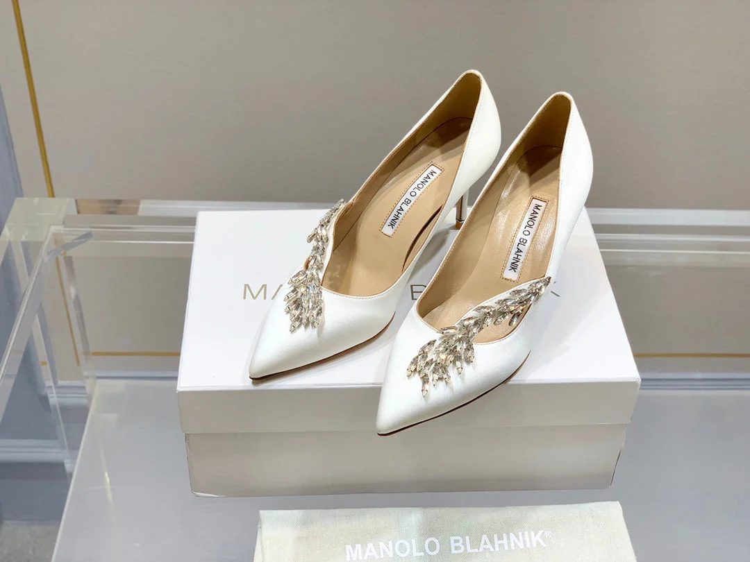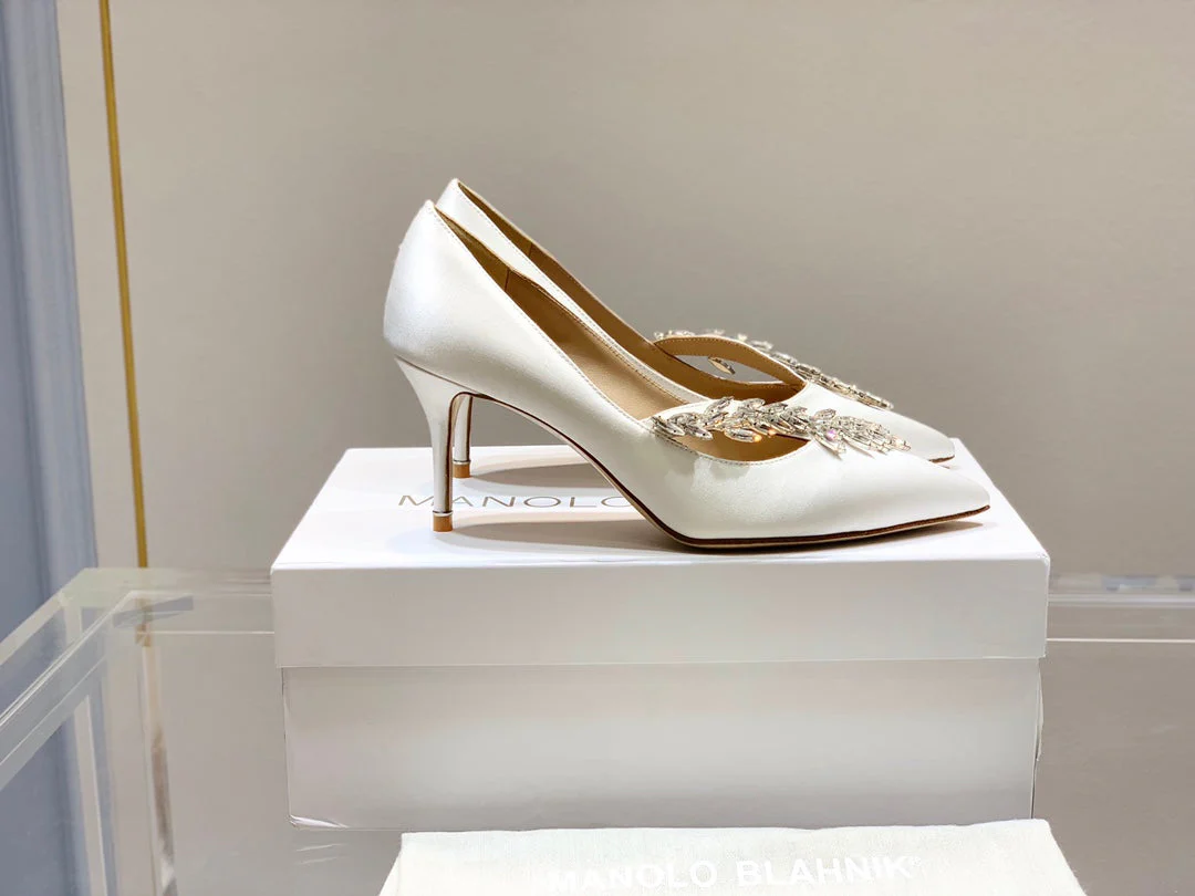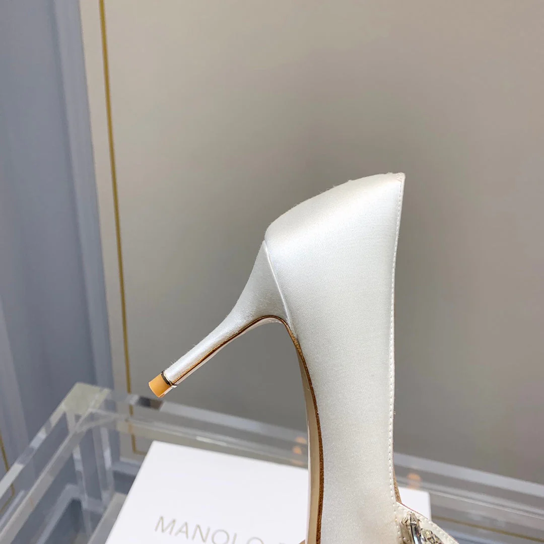 Manolo Wheat Ear Rhinestone High Heels Pumps White Silk Fabric 327453