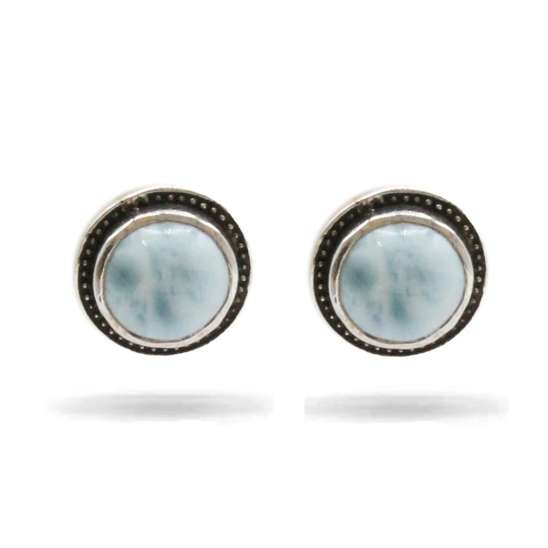 A pair of Marahlago stud earrings, featuring a circular larimar stone.