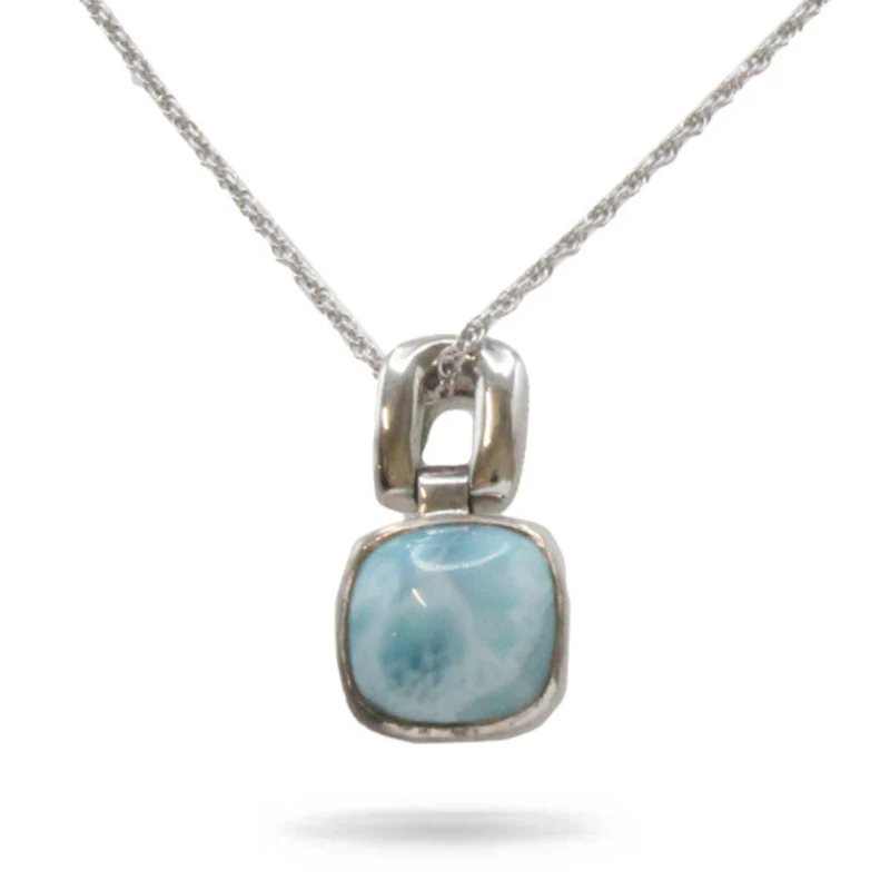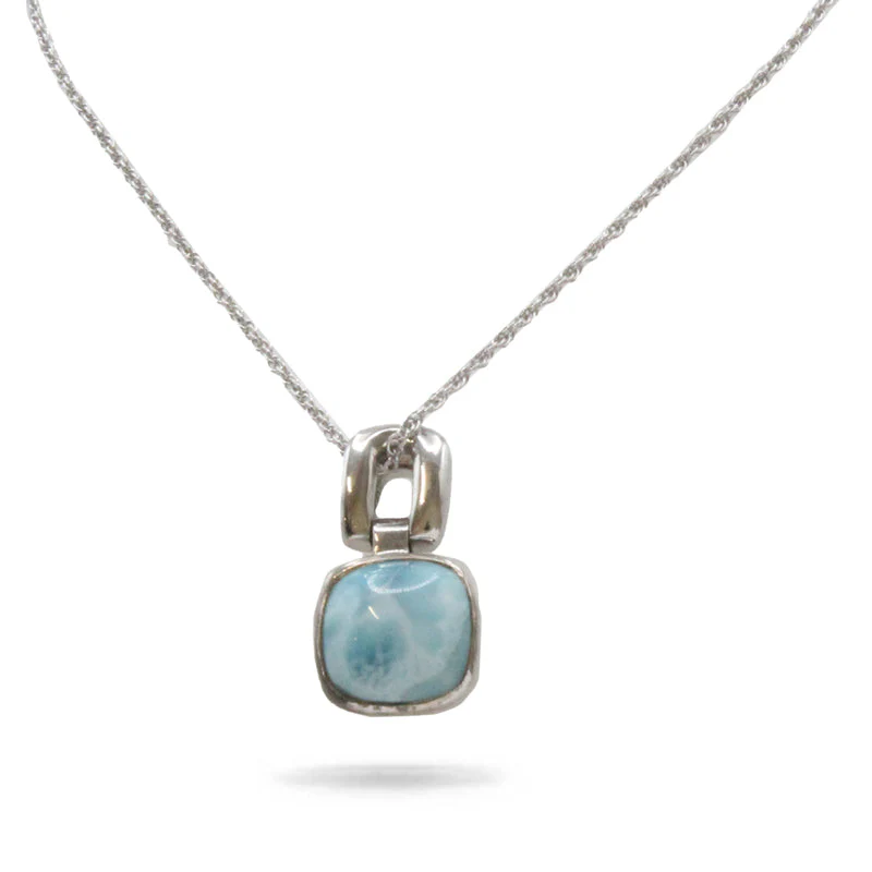 A beautifully detailed sterling silver necklace, including a polished square Larimar gemstone, a gentle and classic reminder of the cool Caribbean ocean breeze.