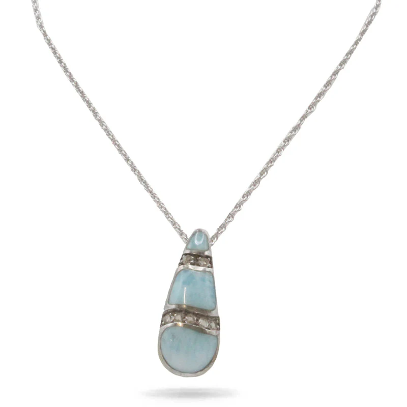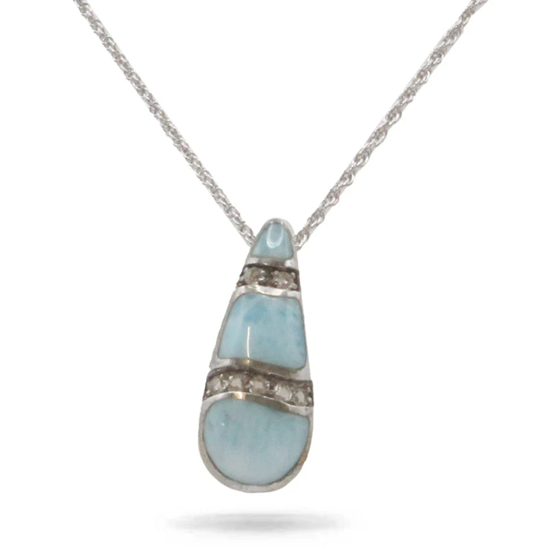 A beautifully detailed sterling silver necklace, including a polished Larimar gemstone with white topaz stones, a gentle and classic reminder of the cool Caribbean ocean breeze.