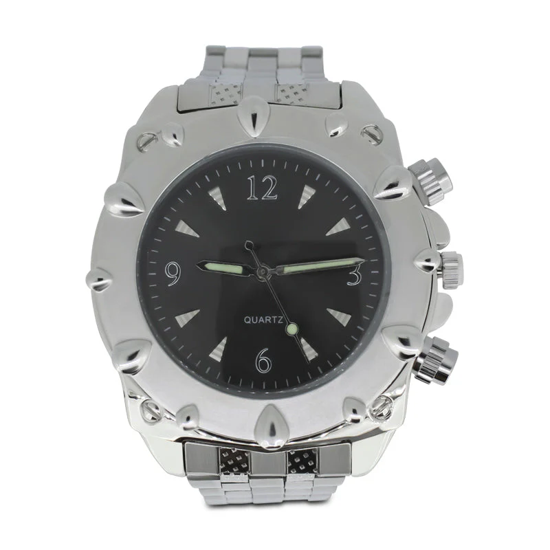 Give a twist to your daily routine wearing the Men’s Silver and Black Quartz Watch. It features a metallic case with silver-tone finish.