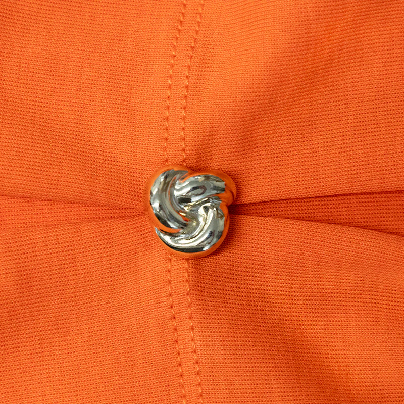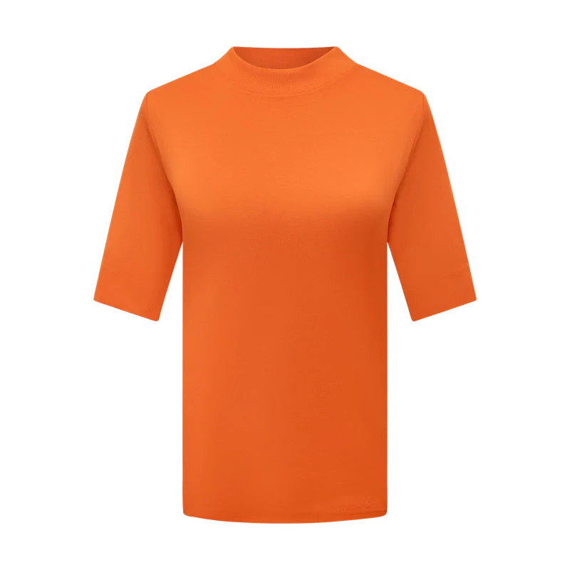 Enhance your wardrobe with the Marc Cain Women’s T-Shirt in a vibrant orange hue. This chic T-shirt features a high-necked, ribbed neckline that adds a touch of sophistication and elegance. Its short sleeves come with subtle slits, highlighting playful design elements, while a decorative button adds a touch of class and flair.