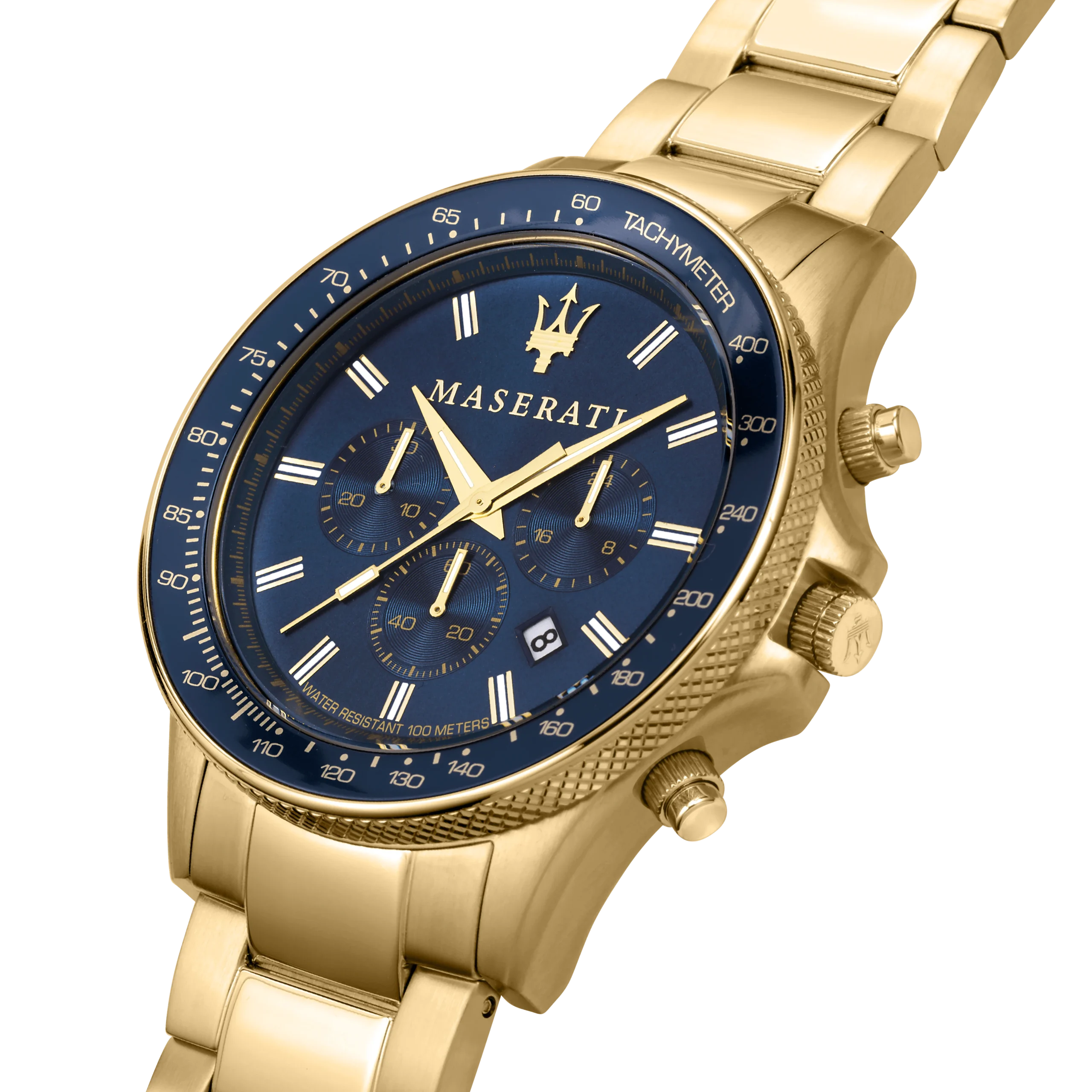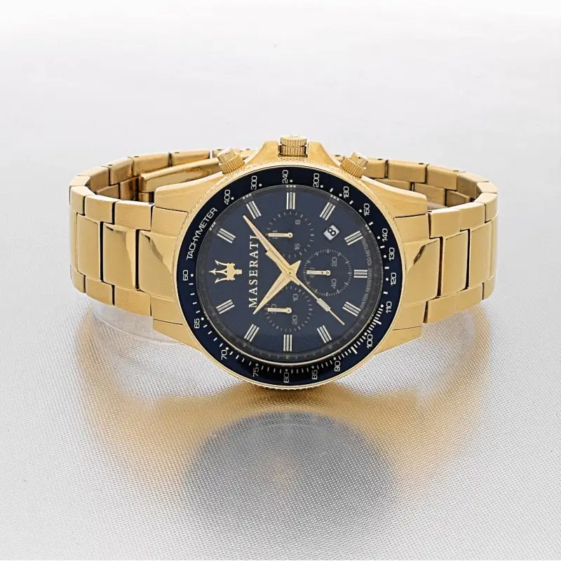 Elevate your style with the Maserati Sfida Gold Chronograph Watch, a masterpiece blending elegance and functionality. Crafted with a robust 44mm stainless steel case, this men’s watch features a striking blue dial that beautifully contrasts with the gold-toned PVD finish. The mineral crystal glass ensures durability and clarity, while the tachymeter bezel allows for precise timing. With a water resistance of up to 100 meters, this watch is designed for both casual outings and formal occasions. The intricate details and craftsmanship pay homage to Maserati’s prestigious heritage, making it an exceptional choice for those who appreciate refined luxury in their accessories.