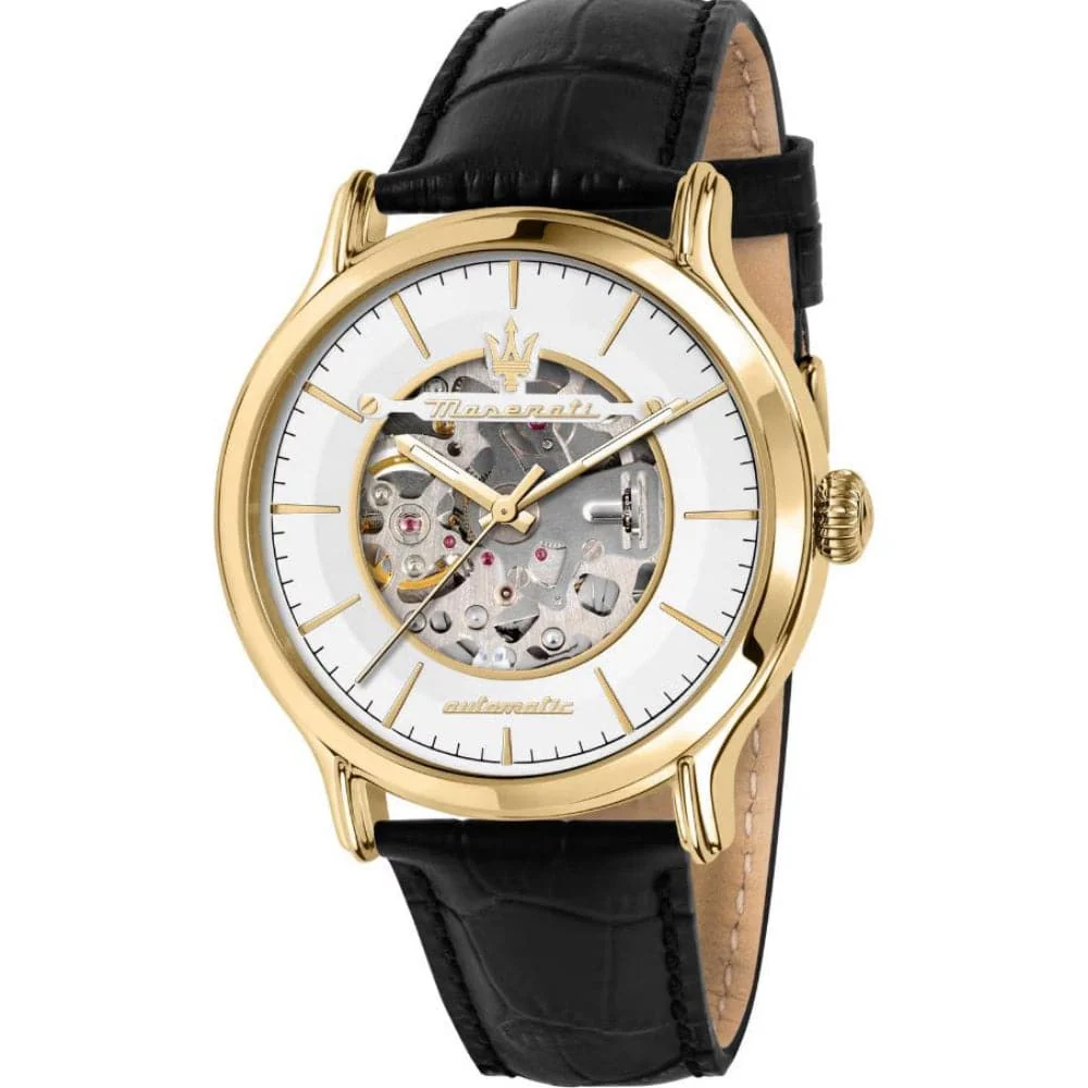MASERATI EPOCA WATCH – R8821118011 – Gender: Male, Case Material & Finish: Stainless Steel, Leather, Case size: 42mm, Case thickness: 13,35, Finishing: Polished, Satin, Case Colour: Gold, Crystal: Sapphire crystal coating, Strap Material: Leather, Strap Colour: Black, Clasp type: Buckle buckle, Movement: Automatic, Water resistant: 10 atm.
