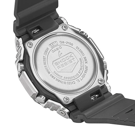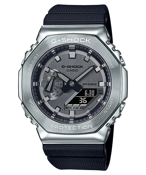 Embrace the bold silhouette of the Metallic CasiOak G-Shock GM2100-1A, a metal-clad evolution of the iconic octagonal design. The bezel in stainless steel frames a brushed dial treated with vapour deposition for a metallic sheen, while a resin band with square dot texture adds facet and grip. Built to endure, it combines Neobrite illumination with Shock Resistant construction, mineral glass and 200-metre water resistance. The case measures 4.93 cm by 4.44 cm by 1.18 cm and weighs 72 g. Functional sophistication includes dual analog-digital timekeeping, world time across 31 time zones, a 1/100-second stopwatch, countdown timer, five daily alarms, super illuminator LED backlight, and a full auto-calendar to 2099. This is a refined men’s watch with G-Shock toughness.