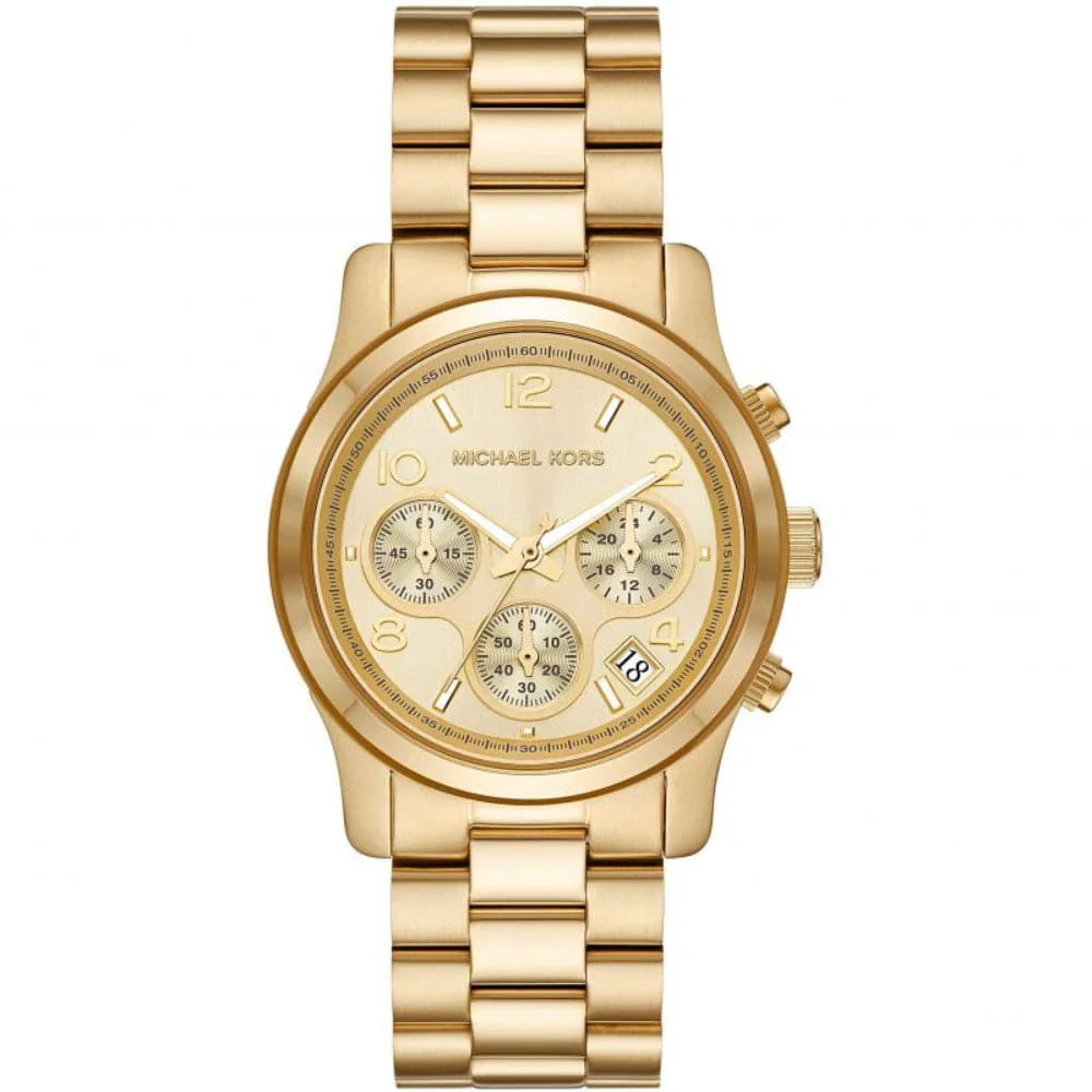 Michael Kors Runway MK7323 is an incredible interesting Ladies watch. Case is made out of Stainless Steel, which stands for a high quality of the item and the Gold dial gives the watch that unique look. This model has 100 meters water resistance – it is suitable for swimming, but not high impact.