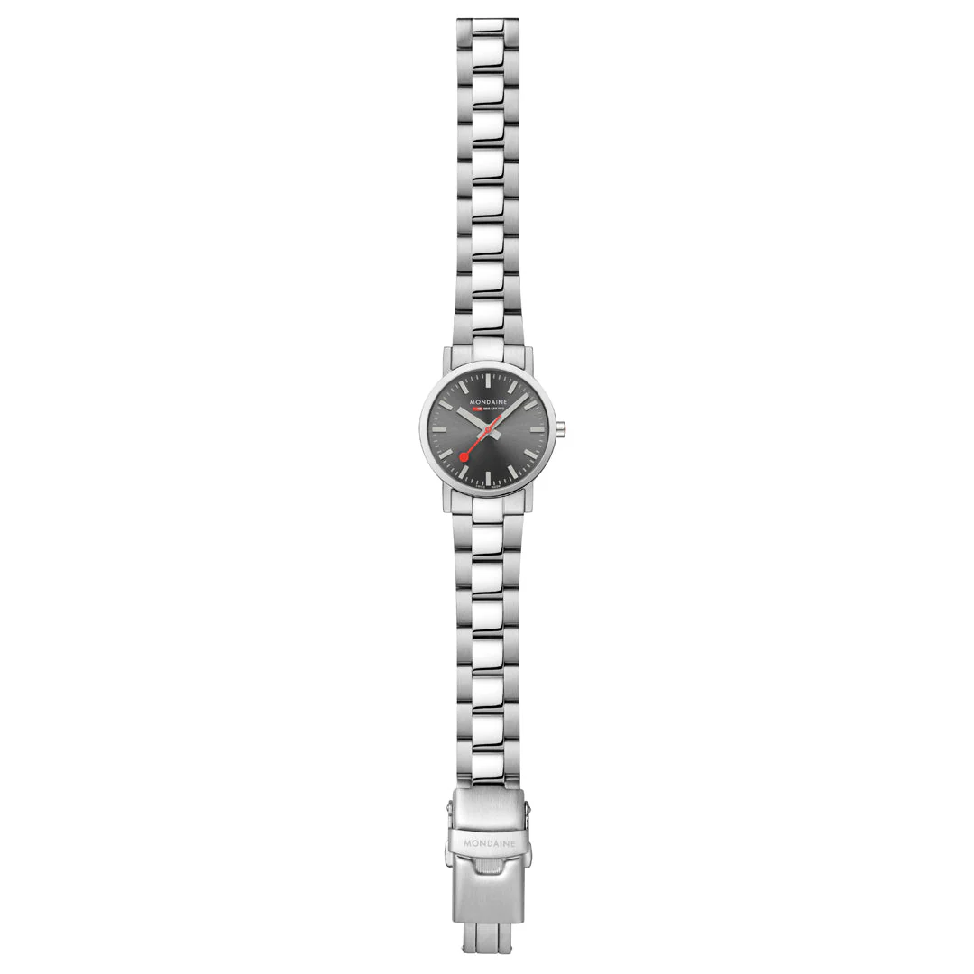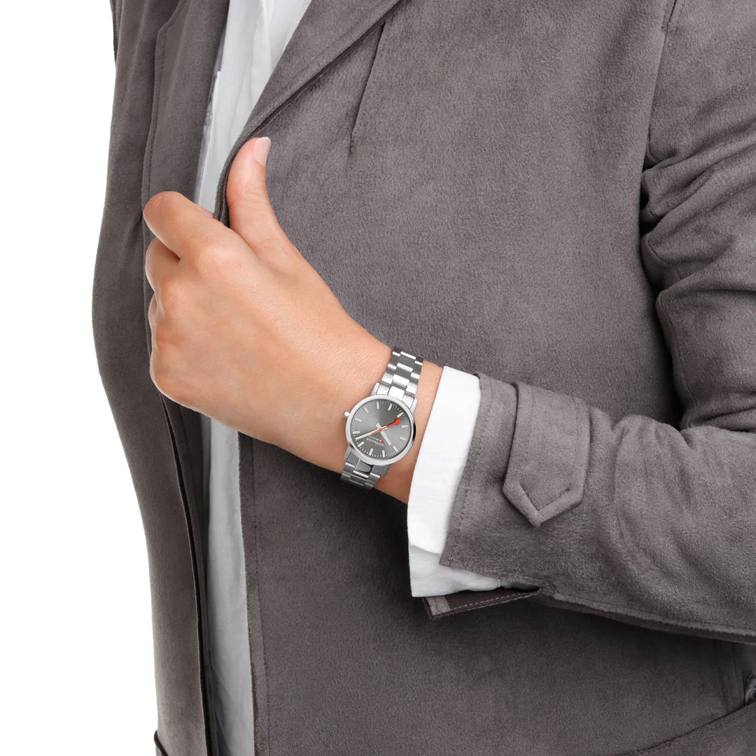 Refined and iconic, the Mondaine Classic Silver Stainless Steel 30 mm Watch captures Swiss precision in a timeless women’s watch designed for effortless elegance. Inspired by the legendary Swiss Railways clock, its grey sunray brushed dial and signature red second hand exude subtle sophistication. The 30 mm stainless steel case integrates seamlessly with a three-link bracelet that balances brushed and polished textures for a modern finish.