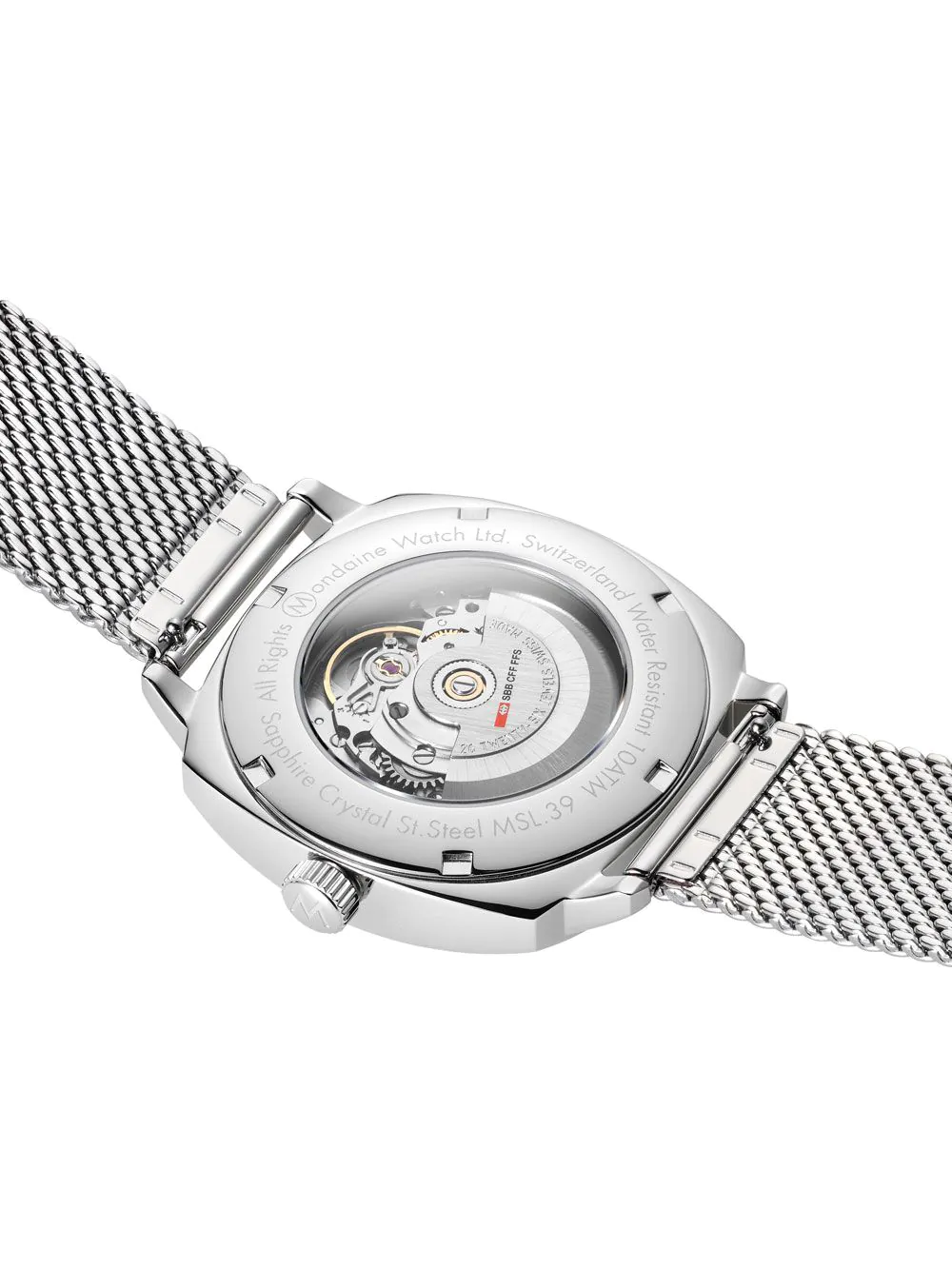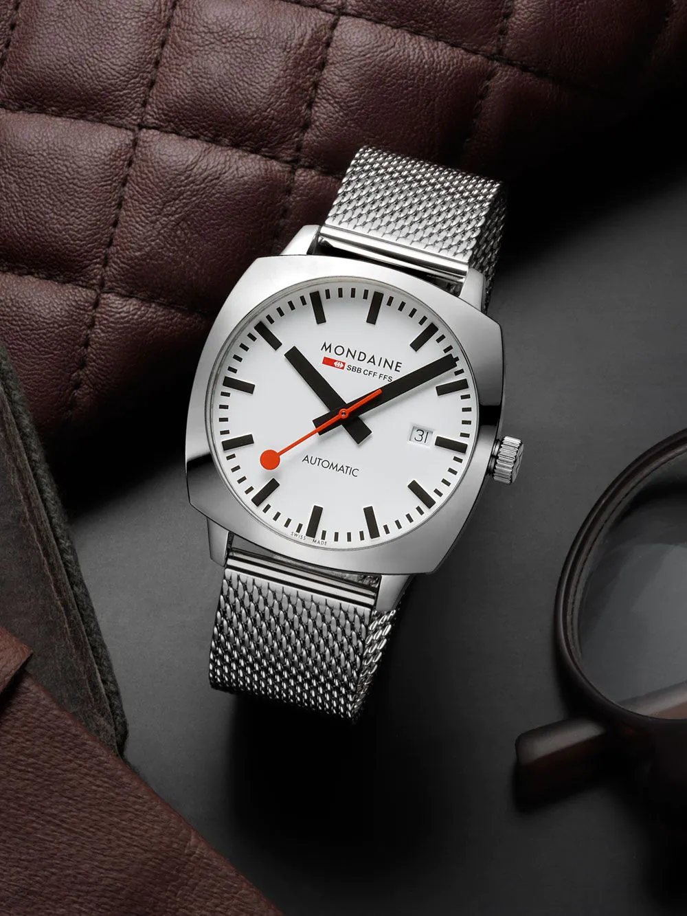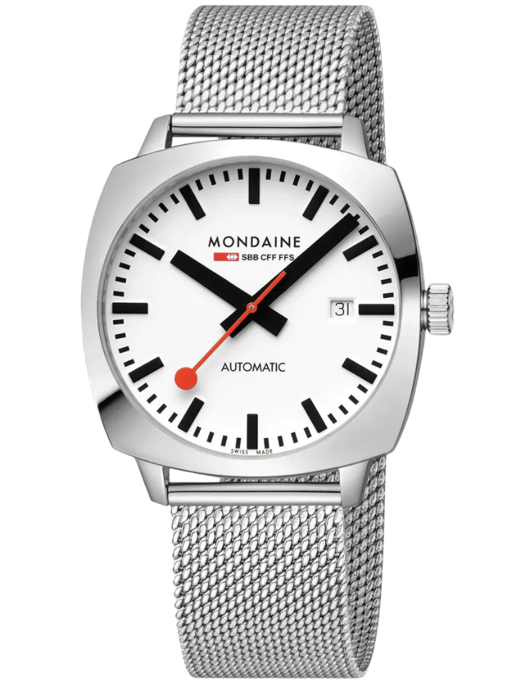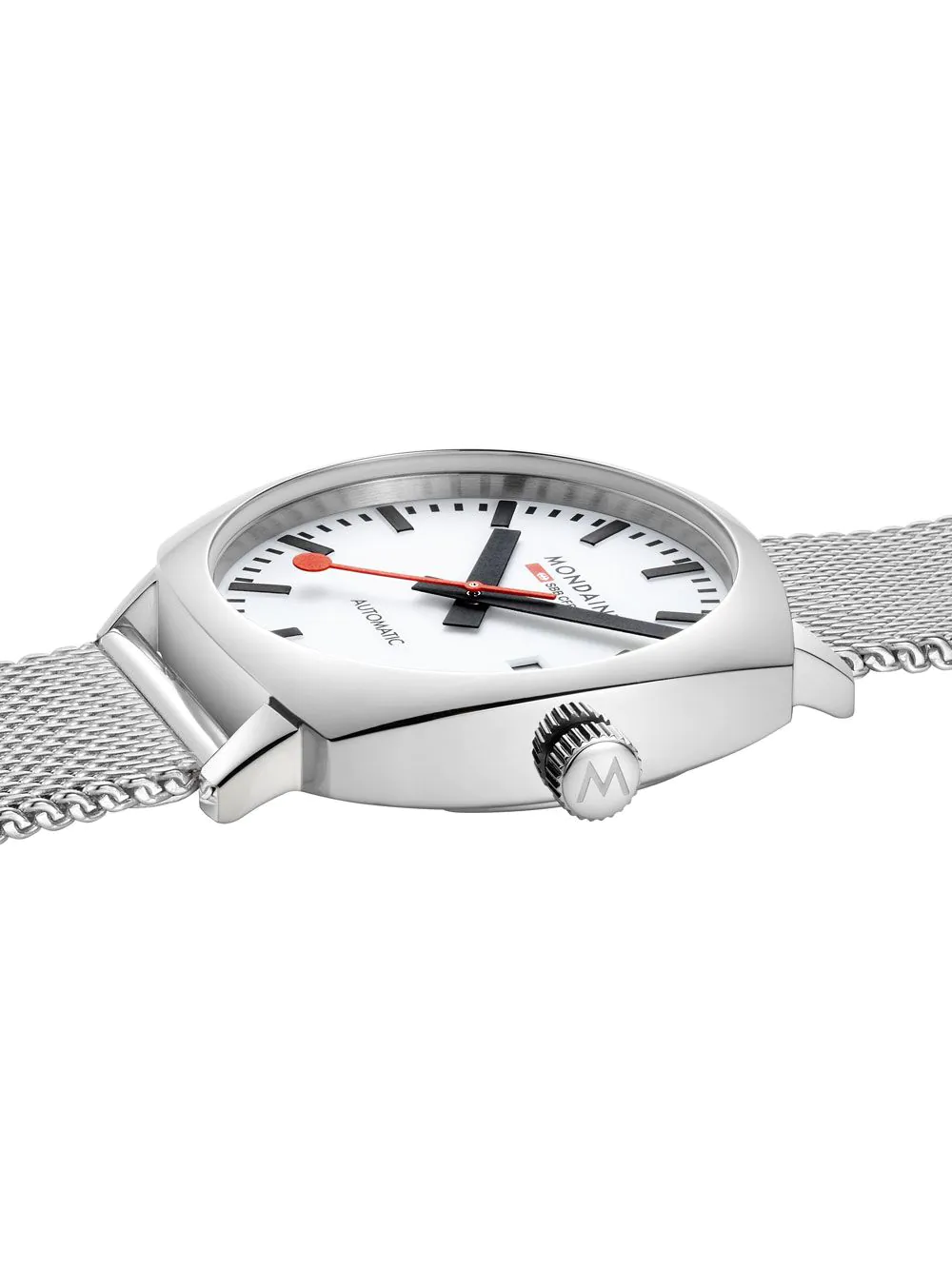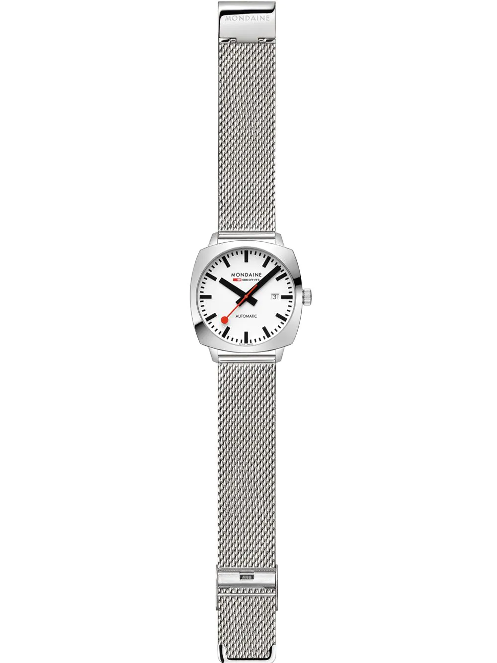 The Mondaine Cushion Automatic White Dial Stainless Steel Watch MSL.3961B.SM embodies elegance and precision, making it a standout choice in men’s watches. Crafted from high-quality stainless steel, this timepiece features a striking white dial accentuated by bold black hour markers and a signature red seconds hand, reflecting Mondaine’s Swiss heritage. Its cushion-shaped case, measuring 39mm, offers a modern aesthetic while housing a reliable automatic movement, powered by the natural motion of your wrist. The integrated stainless steel mesh strap ensures a comfortable fit, while the sapphire crystal provides exceptional scratch resistance. With a water resistance of up to 100 meters, this watch is not only stylish but also built for durability. Elevate your watch collection with this exquisite blend of tradition and innovation.