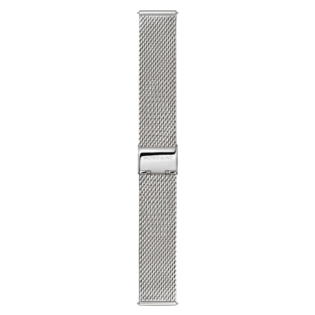 With water resistance of up to 5 ATM, the Mondaine Doppio Solar Watch is designed to withstand the rigors of daily life while maintaining its refined elegance. The tone-in-tone silver-colored case, paired with a stainless-steel mesh strap, provides a sophisticated look that transitions seamlessly from casual outings to formal events. This watch is more than just a timepiece; it’s a conversation starter and a reflection of your commitment to sustainability.
