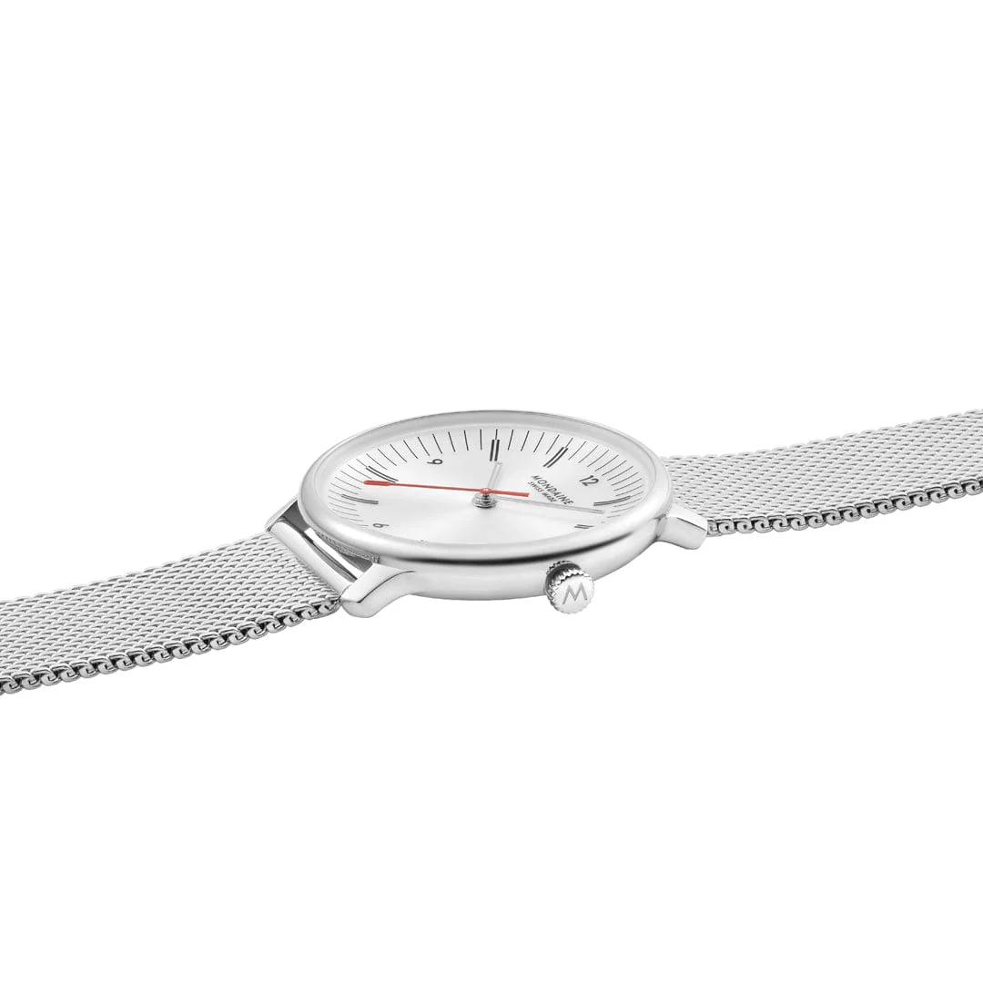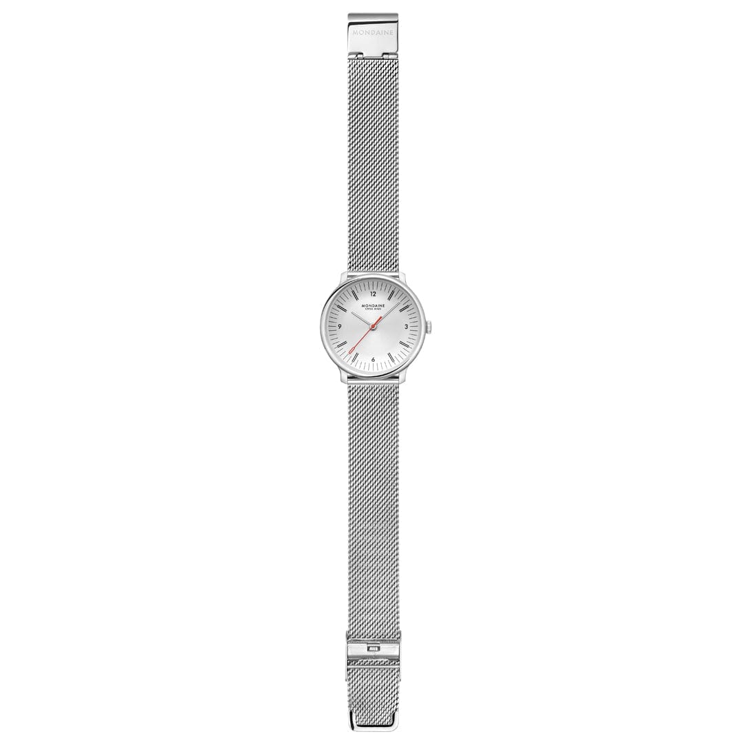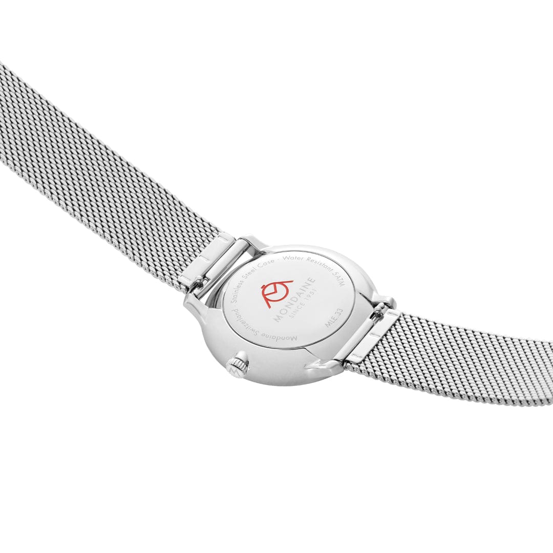 The Mondaine Doppio White Dial Silver Mesh Bracelet Watch MLE.33110.SM encapsulates the essence of Swiss engineering with its refined elegance and contemporary design. Featuring a 33mm polished stainless steel case, this women’s watch boasts an off-white circular-brushed dial framed by a double-domed sapphire crystal, enhancing its aesthetic appeal. The unique double lines on the hands and indexes, along with a dual-tip second hand, emphasize balance and harmony. Powered by a reliable Swiss Quartz movement, it promises precise timekeeping, while the water resistance of up to 50 meters adds functionality for everyday wear. The finely woven stainless steel mesh bracelet seamlessly complements the case, offering versatility for both casual and formal occasions. Elevate your accessory collection with this exquisite piece of craftsmanship.