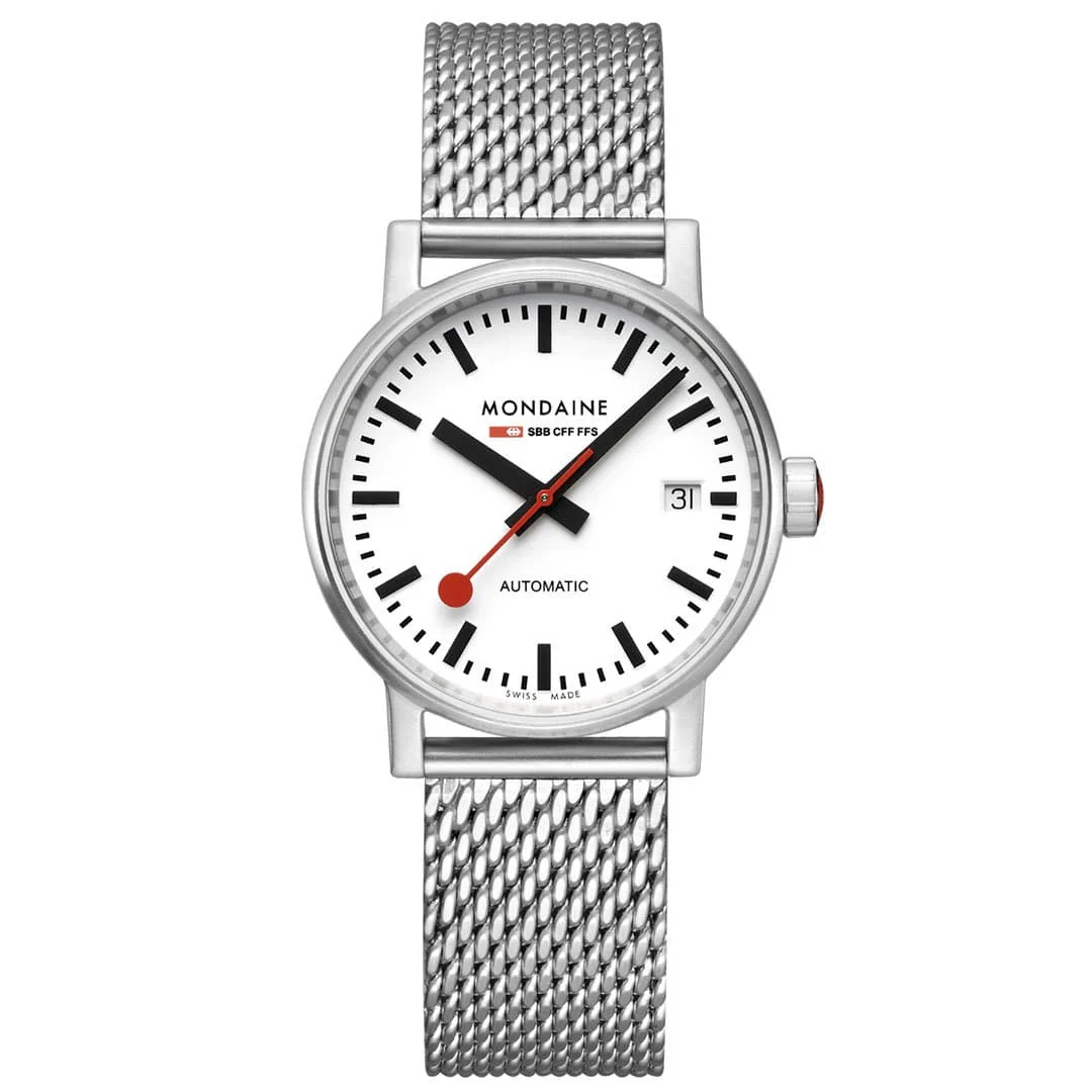 Refined and understated, the Mondaine Evo2 Automatic Stainless Steel White Dial Watch MSE.35610.SM captures the essence of Swiss precision and timeless design. Crafted with a 35mm polished stainless steel case, this women’s watch rests comfortably on the wrist with a sleek silver stainless steel mesh band. The crisp white dial paired with bold black hour markers delivers a clean, minimalist aesthetic, while the domed sapphire crystal ensures lasting clarity and durability. A transparent case back reveals the intricate automatic movement, adding a distinctive touch of mechanical elegance. With 50 meters of water resistance, this timepiece blends practicality with sophistication, making it a distinguished choice for everyday wear.