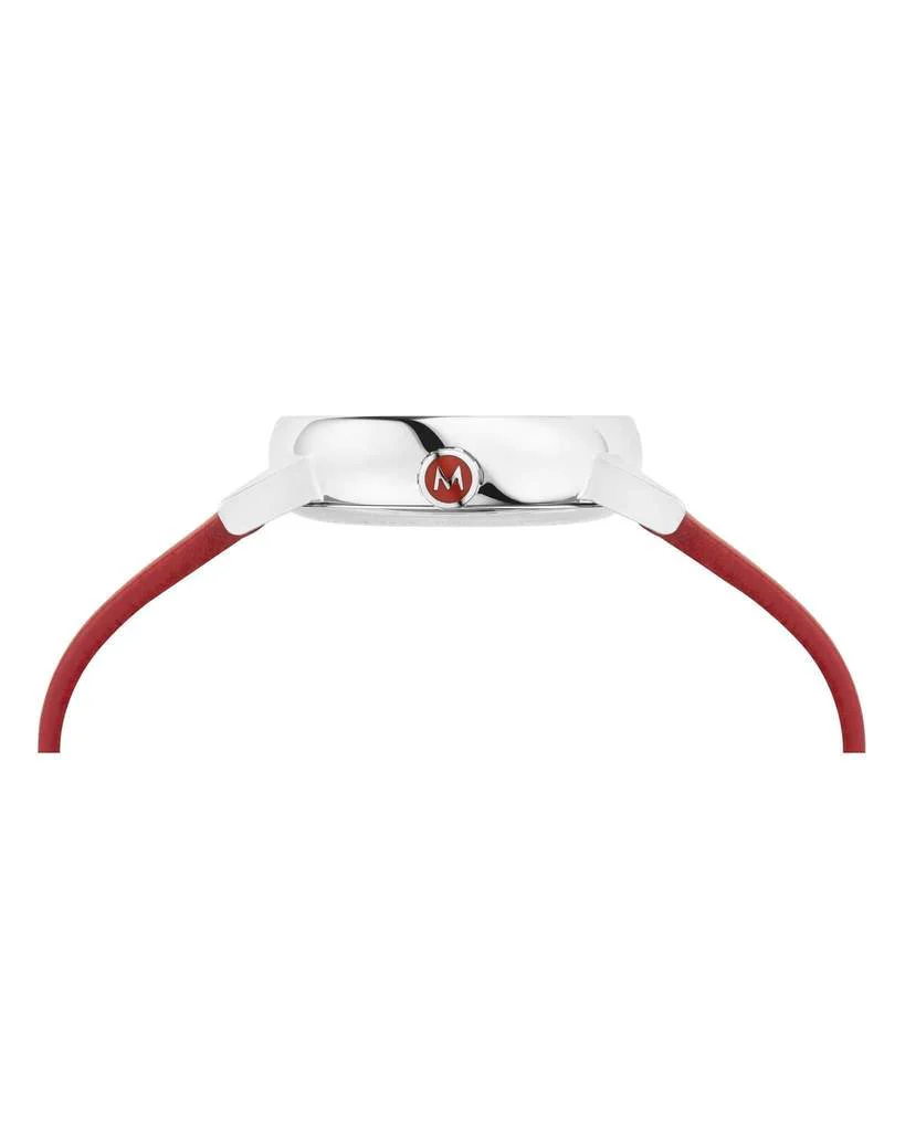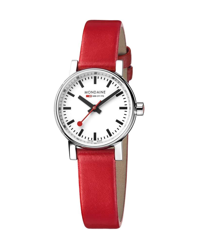 With its harmoniously designed polished stainless steel case and 26mm diameter, this Mondaine evo2 is a watch for small delicate wrists and is very comfortable to wear. The sapphire crystal protects the iconic dial with the prominent red second hand. Thanks to its minimalistic design the watch is highly readable. The ergonomic red crown and the red leather strap highlight Mondaine’s expertise.