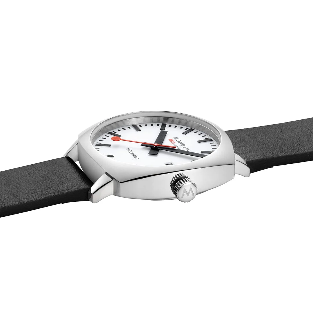 The Mondaine Grand Cushion Automatic White Dial Black Leather Watch MSL.3961B.LBV embodies the essence of Swiss craftsmanship coupled with timeless elegance. This men’s watch features a striking 39mm stainless steel case that seamlessly blends classic design with modern flair. The crisp white dial, accentuated by an iconic red second hand, pays homage to the renowned Swiss railway clocks. Powered by a reliable automatic movement, it offers a 38-hour power reserve without the need for a battery, promoting sustainability. The luxurious black vegan leather strap ensures comfort while the anti-reflective sapphire crystal provides clarity in all lighting conditions. With water resistance up to 100 meters and patented BackLight technology, this watch is both practical and stylish, making it a versatile accessory for any occasion. Experience the perfect harmony of heritage and innovation with this exceptional timepiece.