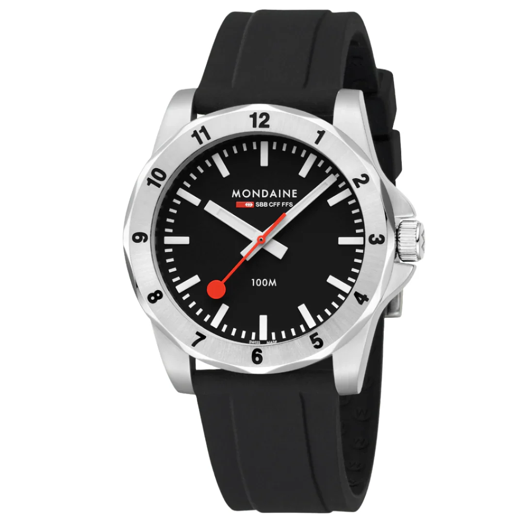 The deep black dial provides a striking contrast to the luminous hands and signature red seconds hand, a hallmark of Mondaine’s heritage. Engineered for clarity, this watch incorporates Super-LumiNova® technology, ensuring optimal visibility even in low-light conditions. Protected by anti-reflective sapphire crystal, the dial remains crisp and legible from every angle, reinforcing the watch’s commitment to both durability and style.