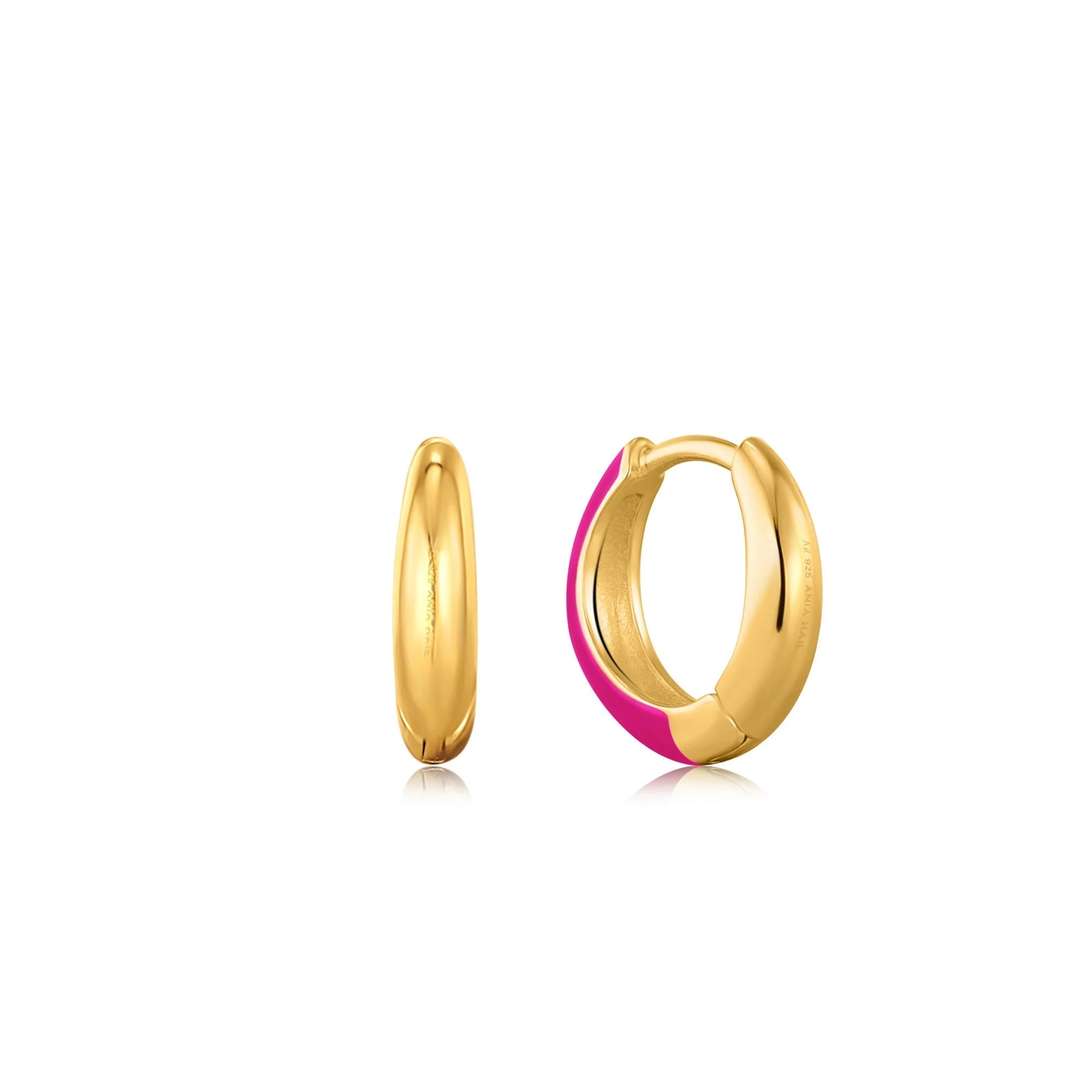 Elevate your jewelry collection with these Neon Pink Enamel Gold Sleek Huggie Hoop Earrings from Ania Haie, crafted in 14kt gold-plated sterling silver and finished with a vibrant neon pink enamel. The refined 12mm hoops offer a chic, modern profile that feels both lightweight and comfortable, perfect for day-to-night wear. Distinctive and luxurious, these huggie earrings blend contemporary fashion with enduring craftsmanship, delivering a bold statement piece that stands out effortlessly. Designed for those who appreciate unique style and quality, this pair adds a touch of trend-forward elegance to any look.