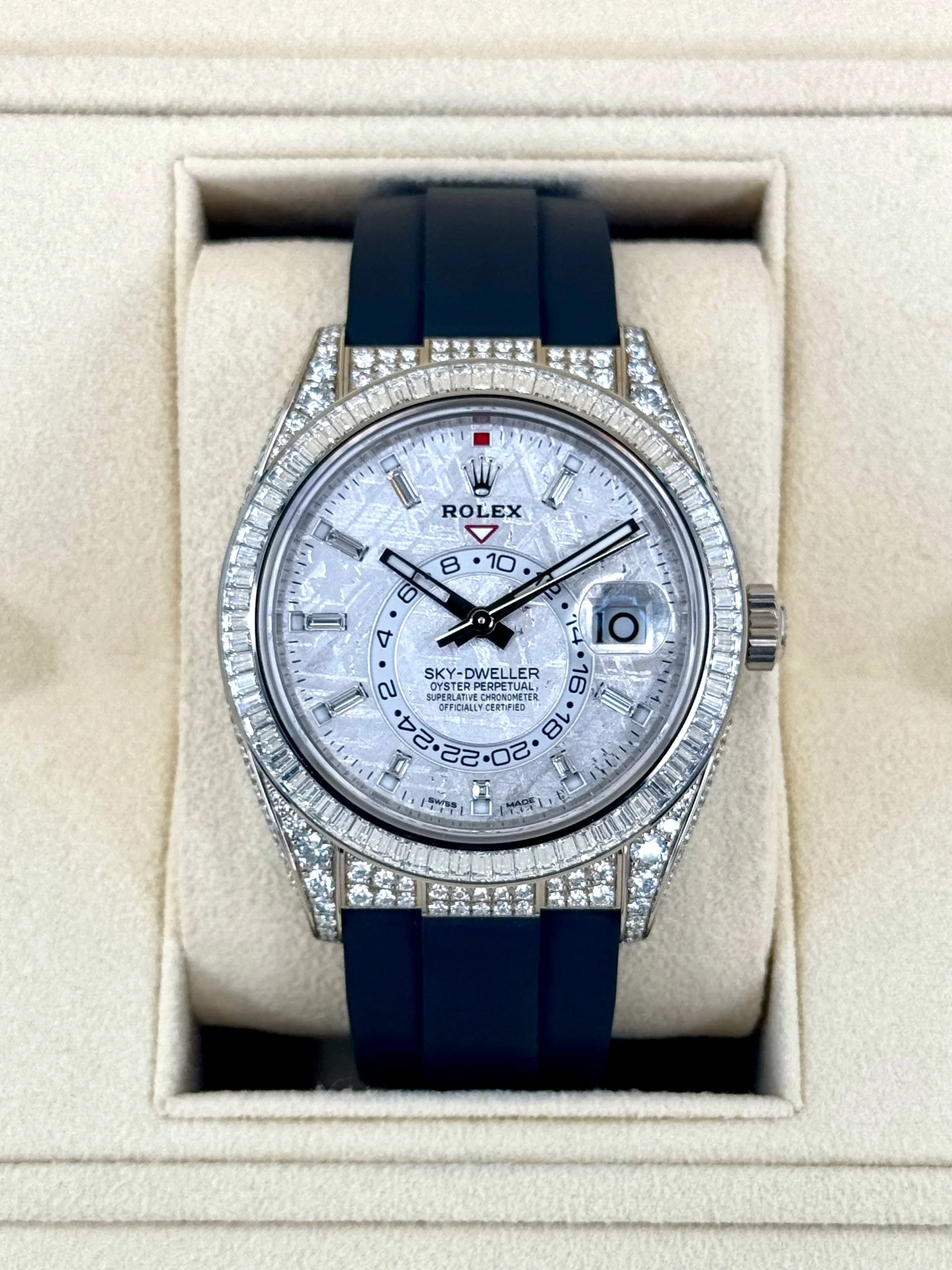 NEW 2023 Rolex Sky-Dweller 42mm 18K White Gold Meteorite Dial, an Oysterflex Bracelet, with Diamond Baguette Hour Markers and Rolex Factory  Original Brilliant-Cut Diamonds throughout the bezel, case, and clasp. Offering an exquisite display of Rolex’s gem-setting expertise.