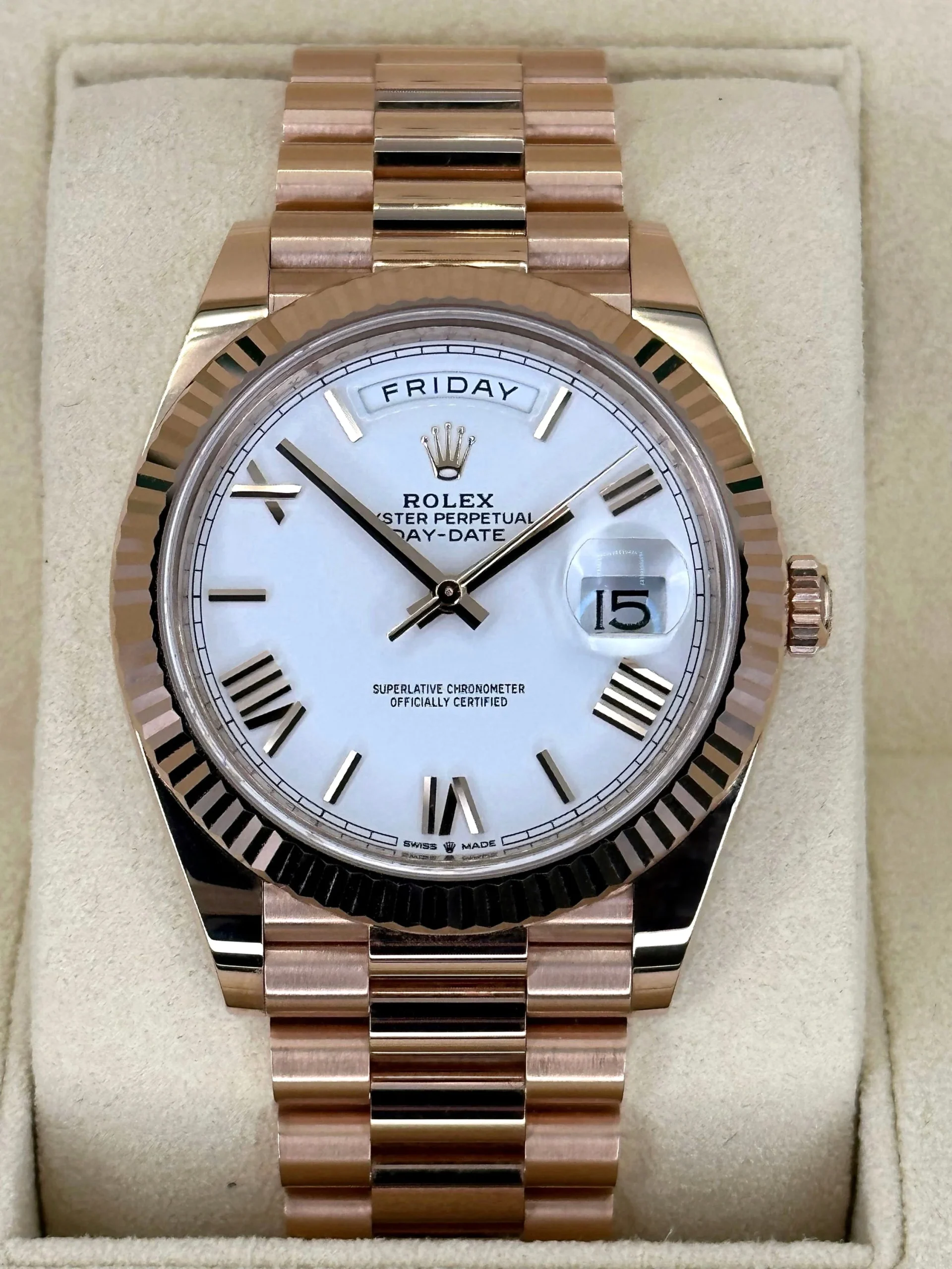 NEW 2024 Rolex Day-Date 228235 Presidential Bracelet 18 kt Everose Gold White Dial Fluted Bezel