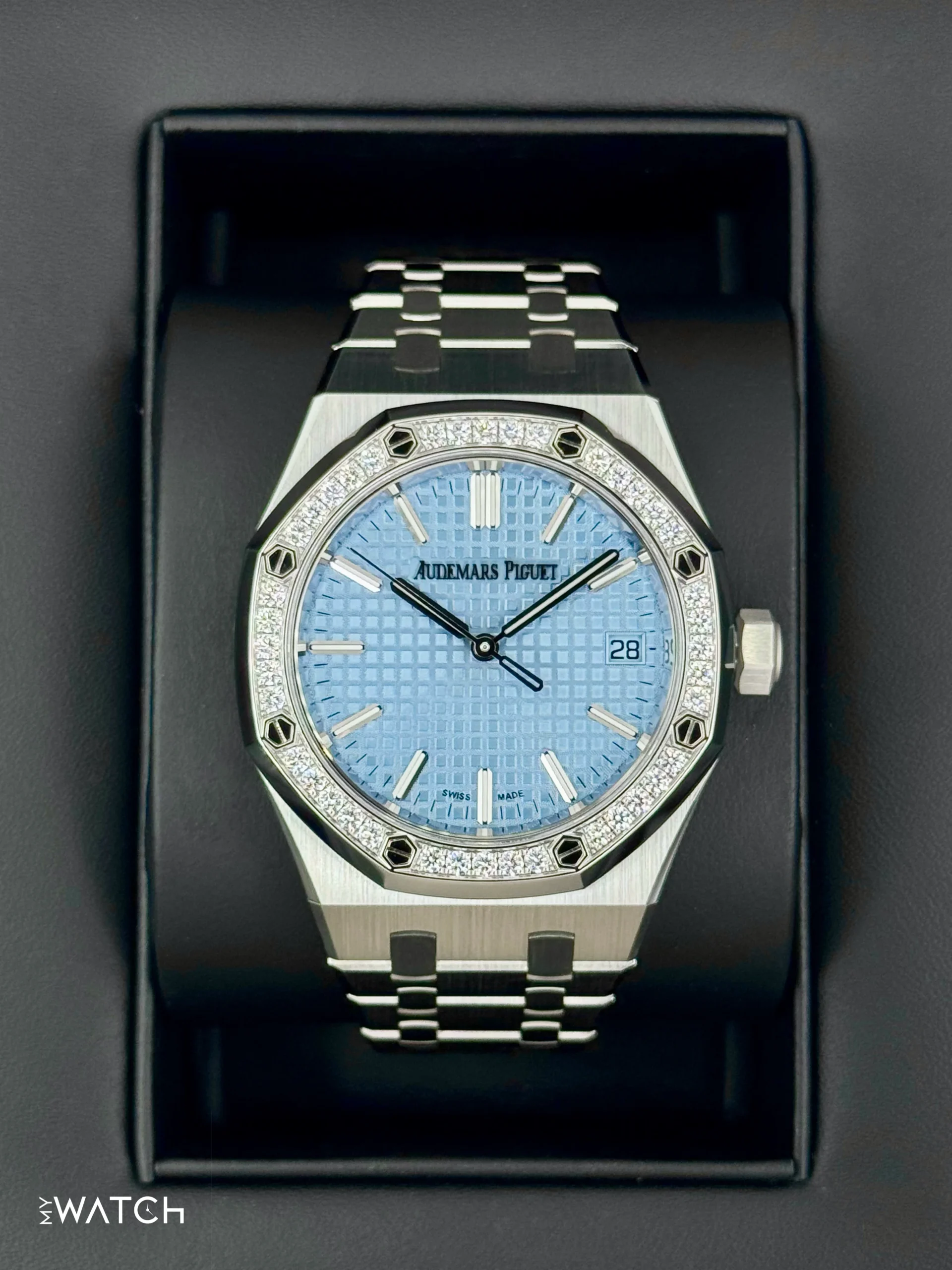 NEW 2025 Ladies Audemars Piguet Royal Oak 37mm 15551ST.ZZ.1356ST.01 Stainless Steel Diamond Bezel light (Ice) blue “Grande Tapisserie” Dial