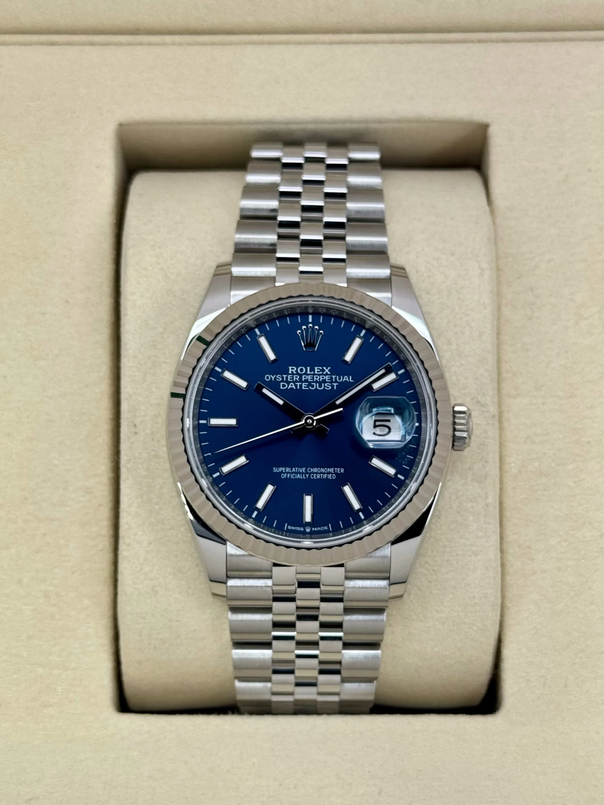 NEW 2025 Rolex Datejust 36mm 126234 Stainless Steel and 18k White Gold Fluted Bezel Jubilee Bracelet Blue Dial