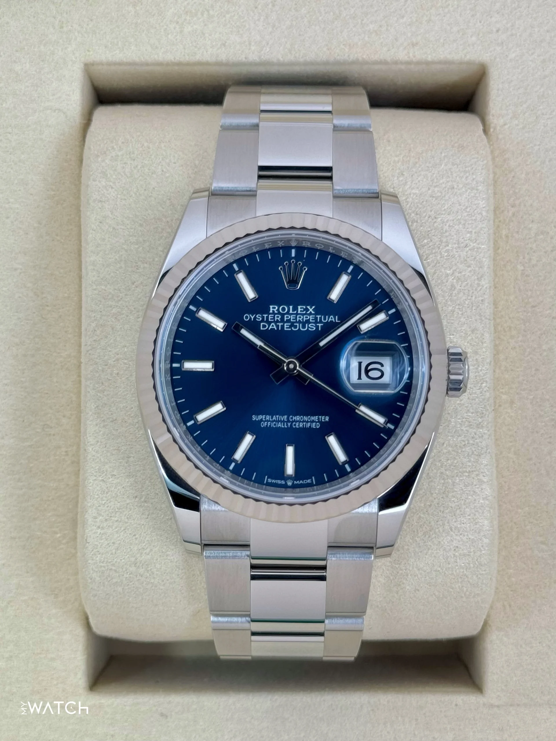 NEW 2025 Rolex Datejust 36mm 126234 Stainless Steel Oyster Bracelet Blue Dial and 18K White Gold Fluted Bezel
