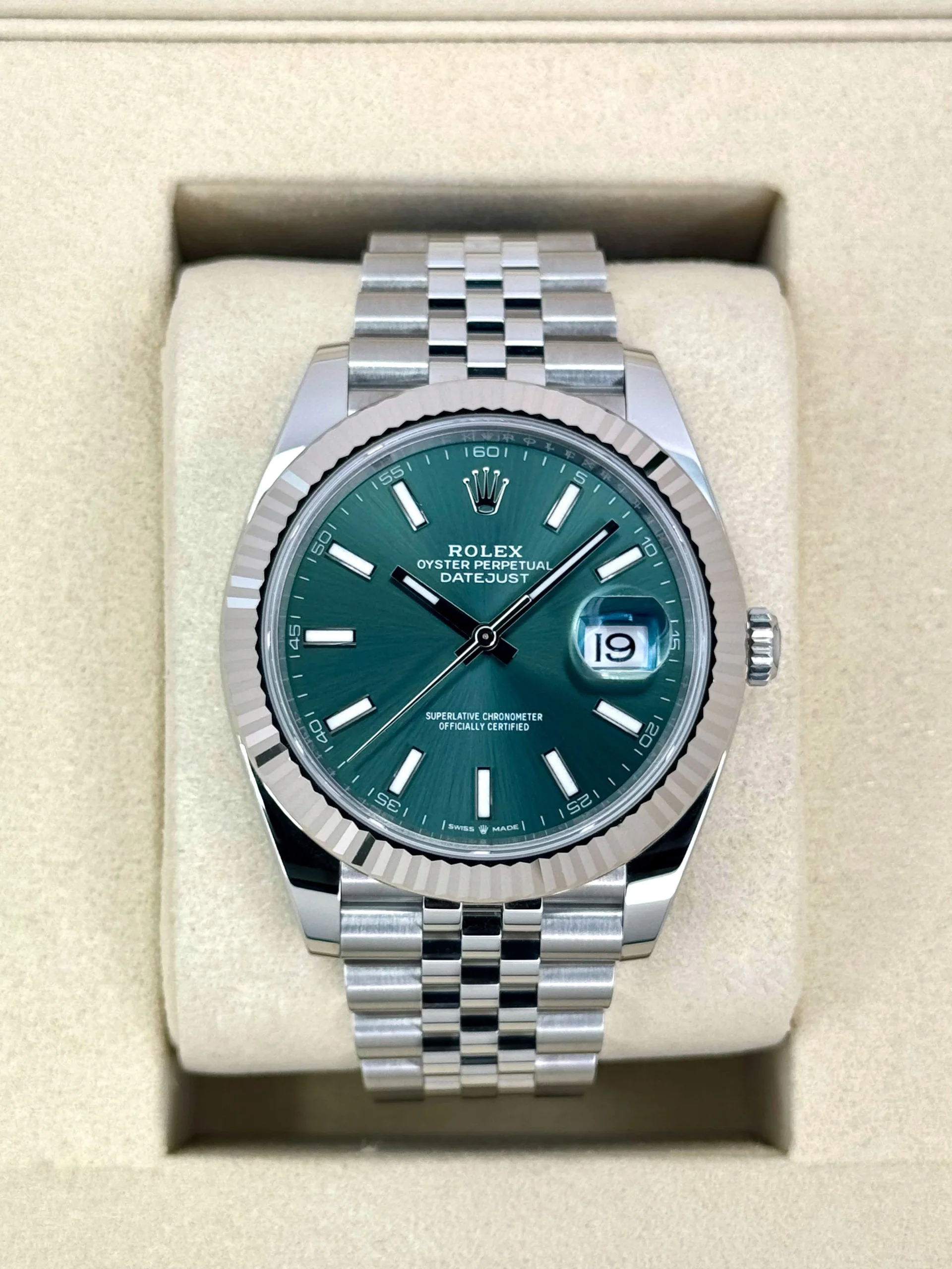 NEW 2025 Rolex Datejust 41mm 126334 (m126334-0028) Stainless Steel and 18k White Gold Fluted Bezel Jubilee Bracelet Mint Green Dial