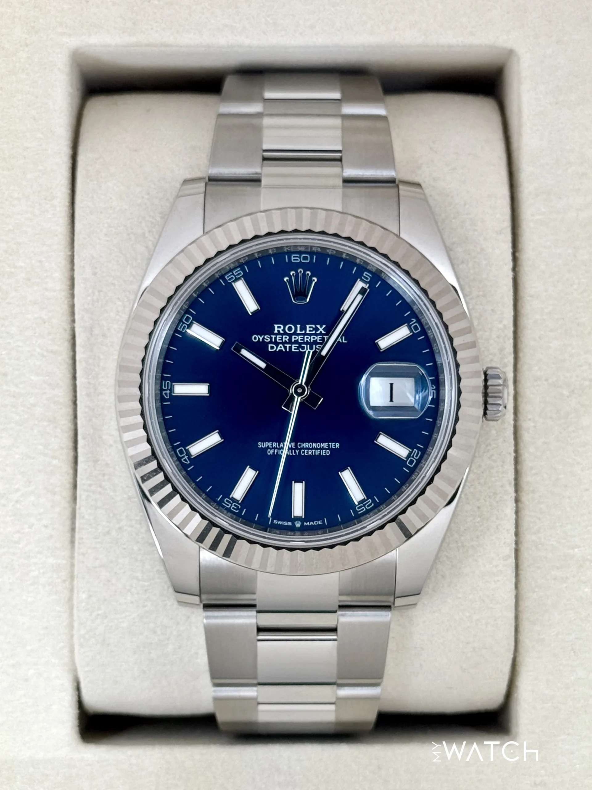 NEW 2025 Rolex Datejust 41mm 126334 Stainless Steel and 18kt White Gold Fluted Bezel Oyster Bracelet Bright Blue Dial