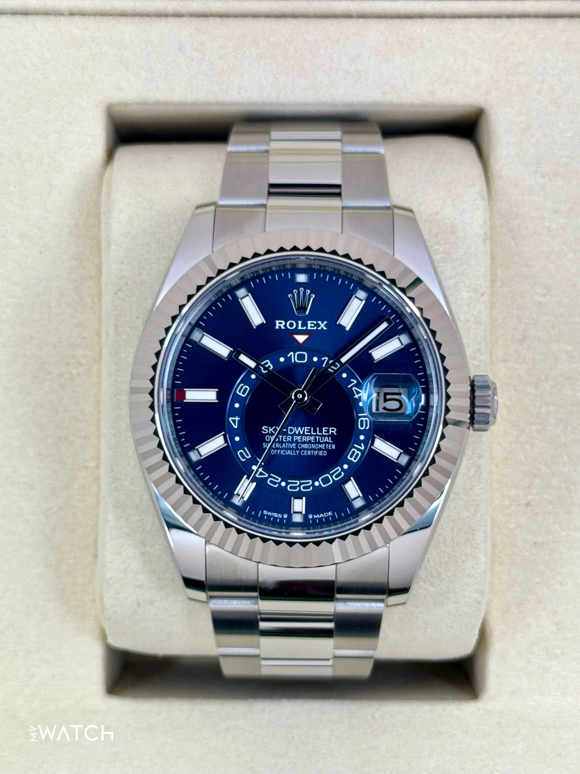 NEW 2025 Rolex Sky-Dweller 42mm 336934 Stainless Steel and 18k White Gold Fluted Bezel Oyster Bracelet Blue Dial