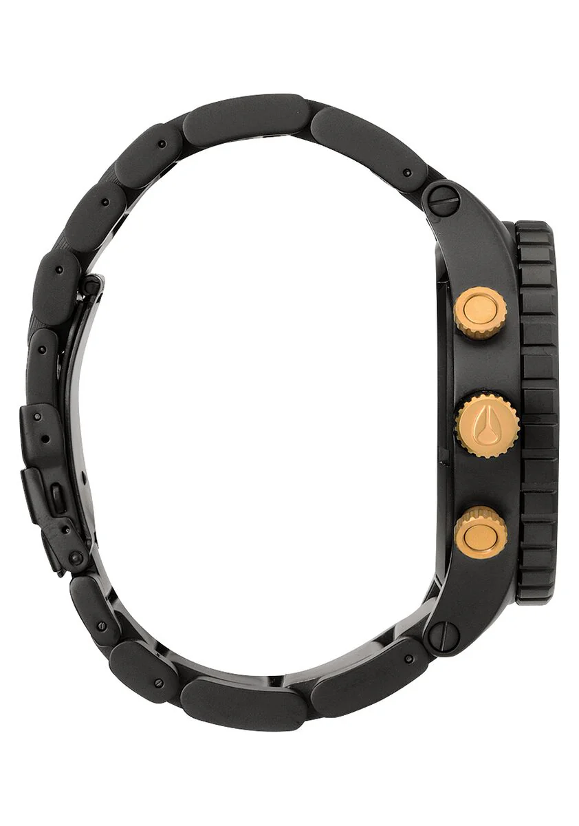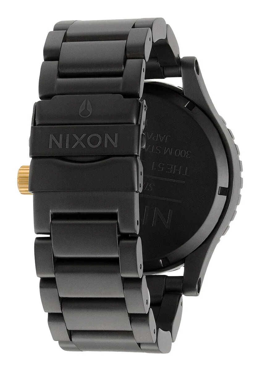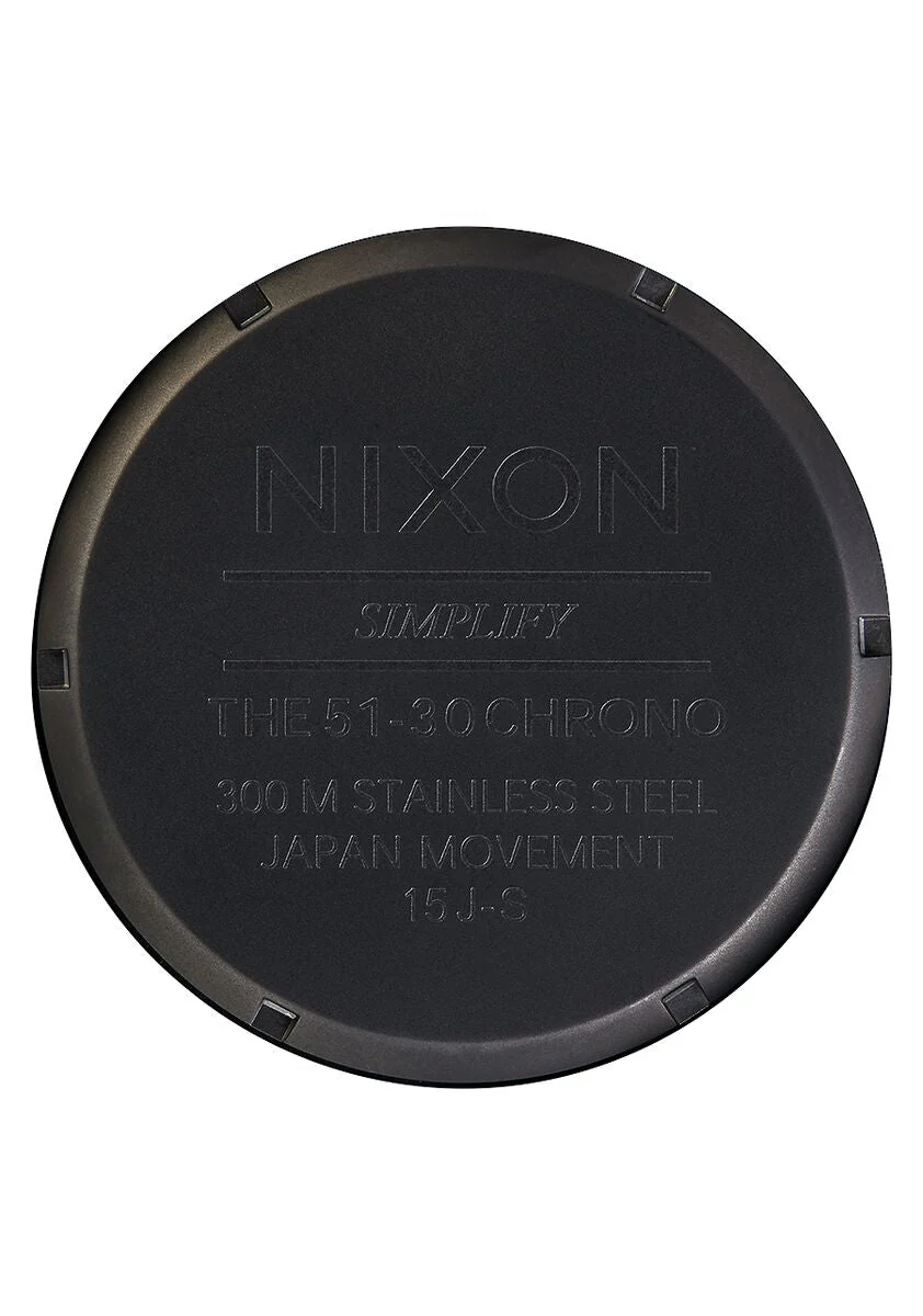 The Nixon 51-30 Chrono men’s watch delivers bold style with rugged performance, featuring a commanding 51mm stainless steel case and a striking black dial accented by gold-tone details. Designed for those who live unbound, its uni-directional bezel and six-hand chronograph with 24-hour and second subdials offer precision functionality, while the crown and pushers at 9 o’clock provide comfort through active wear. Crafted with a durable stainless steel band and hardened mineral glass, this timepiece is engineered for depth with 300-meter water resistance. A refined fusion of oversized design and professional-grade movement, it redefines the standard in modern chronograph watches.