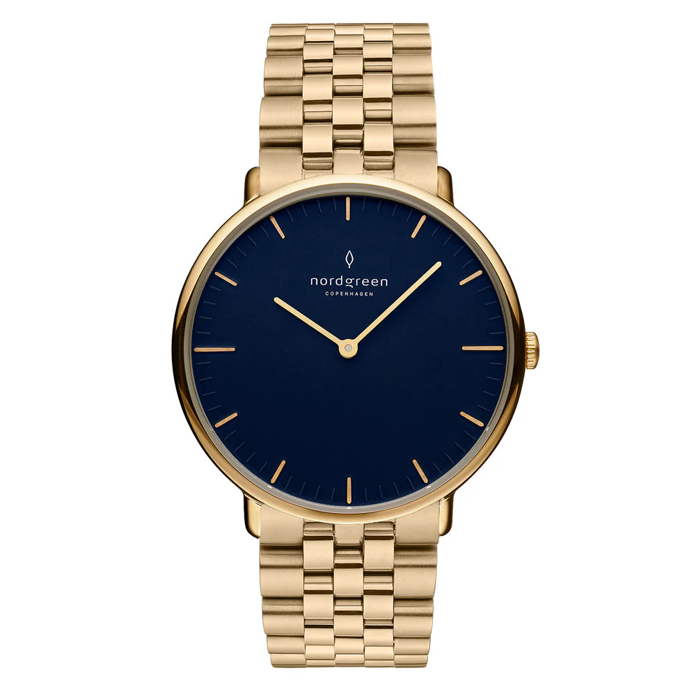 Refined and understated, the Nordgreen Native 36mm gold men’s watch captures the essence of Danish design with its clean lines and timeless form. Crafted with a stainless steel 5-link gold bracelet and a sleek minimalist navy blue dial, this piece blends modern elegance with everyday functionality. The 36mm case is complemented by hardened mineral glass and a reliable quartz movement, delivering both durability and precision. Designed by Jakob Wagner, it offers water resistance up to 30 meters and features interchangeable straps for added versatility. Packaged in an ethical Nordgreen box, this watch stands out in the men’s watch category for its balance of sophistication, sustainability, and Scandinavian craftsmanship.